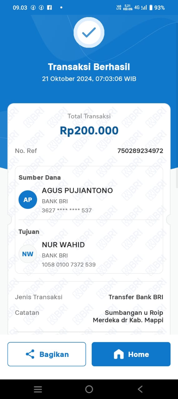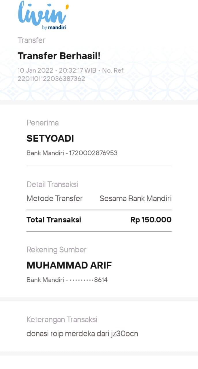 | 461 | 10-01-2021 | Rp 20.000,- | - | Donasi untuk ROIP Merdeka dari JZ19GFW SALAPUDDIN | Ada | - |
