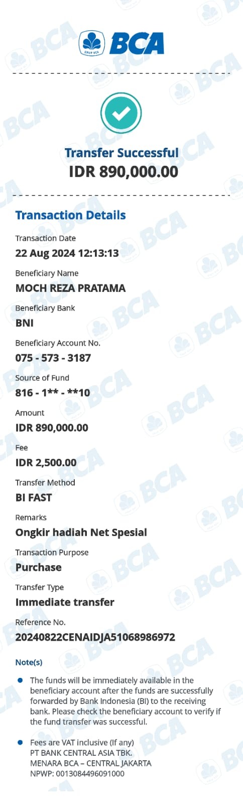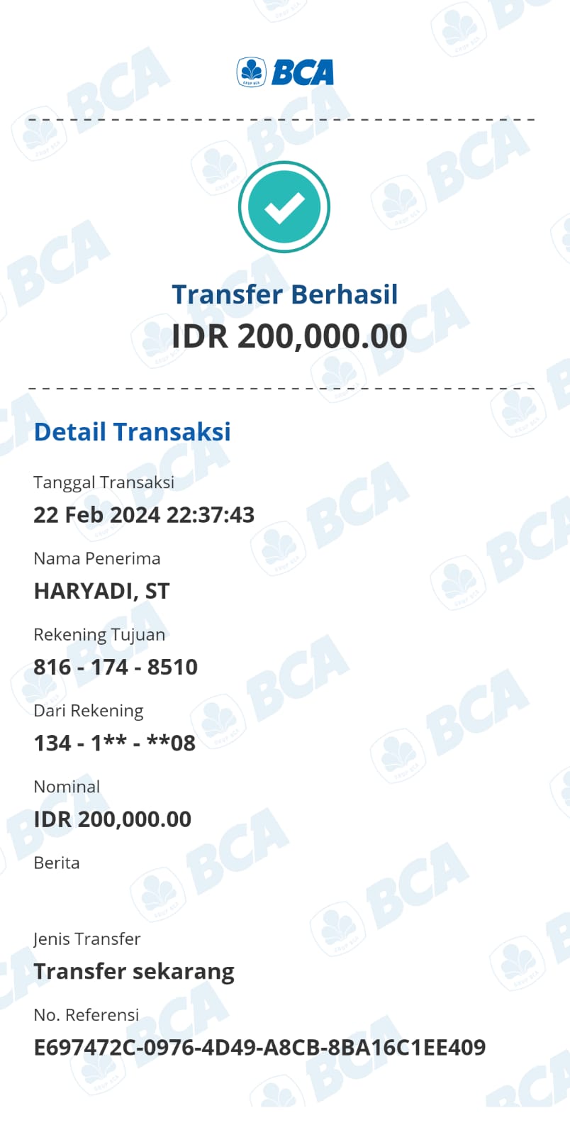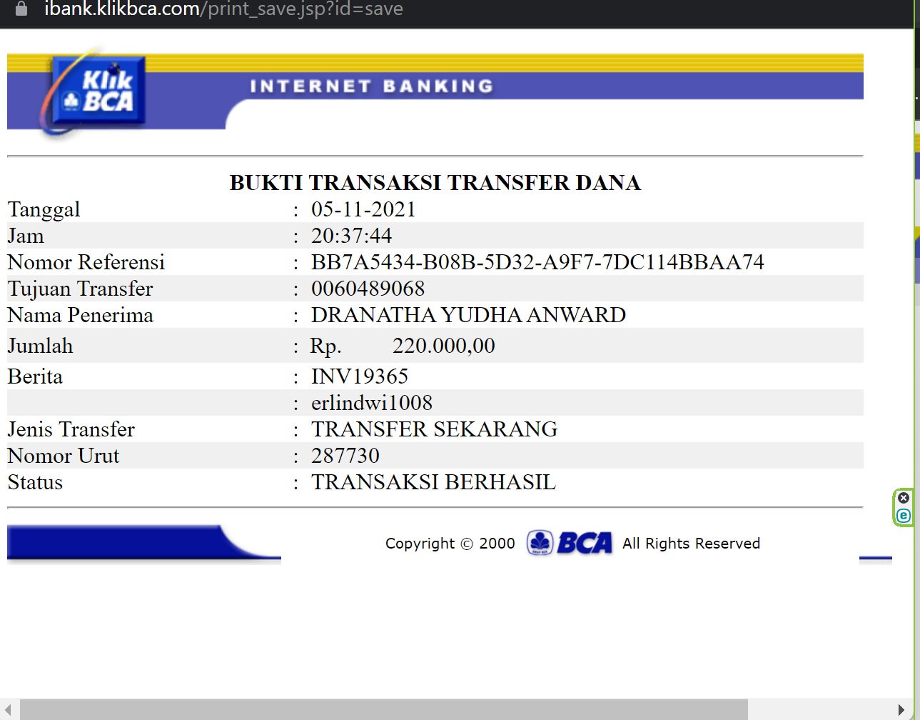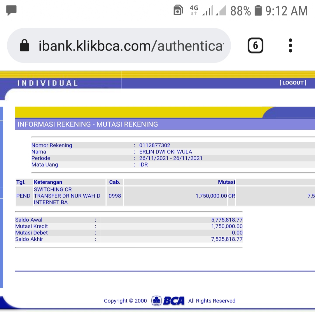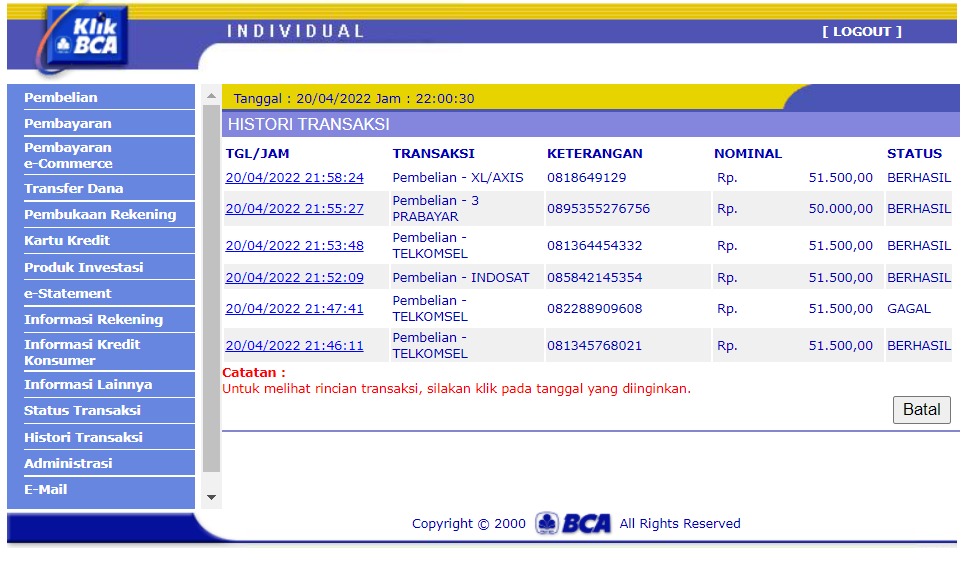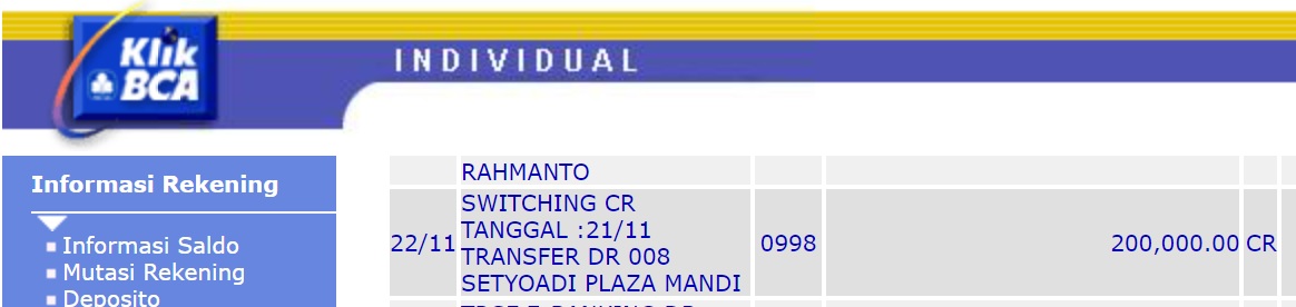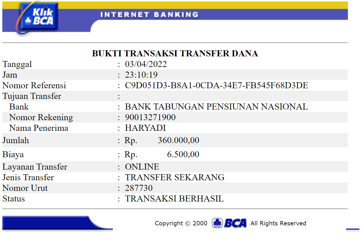 Kunjungi situs: https://ibank.klikbca.com/User ID: HARYADIS3110. PIN Internet Banking: 123456