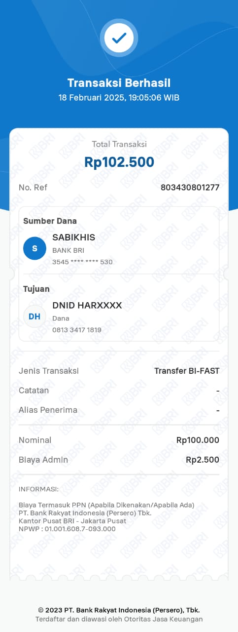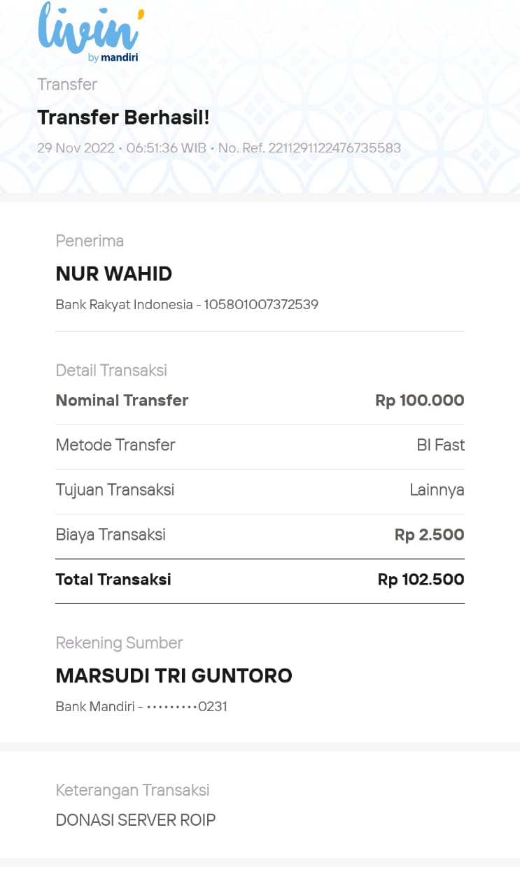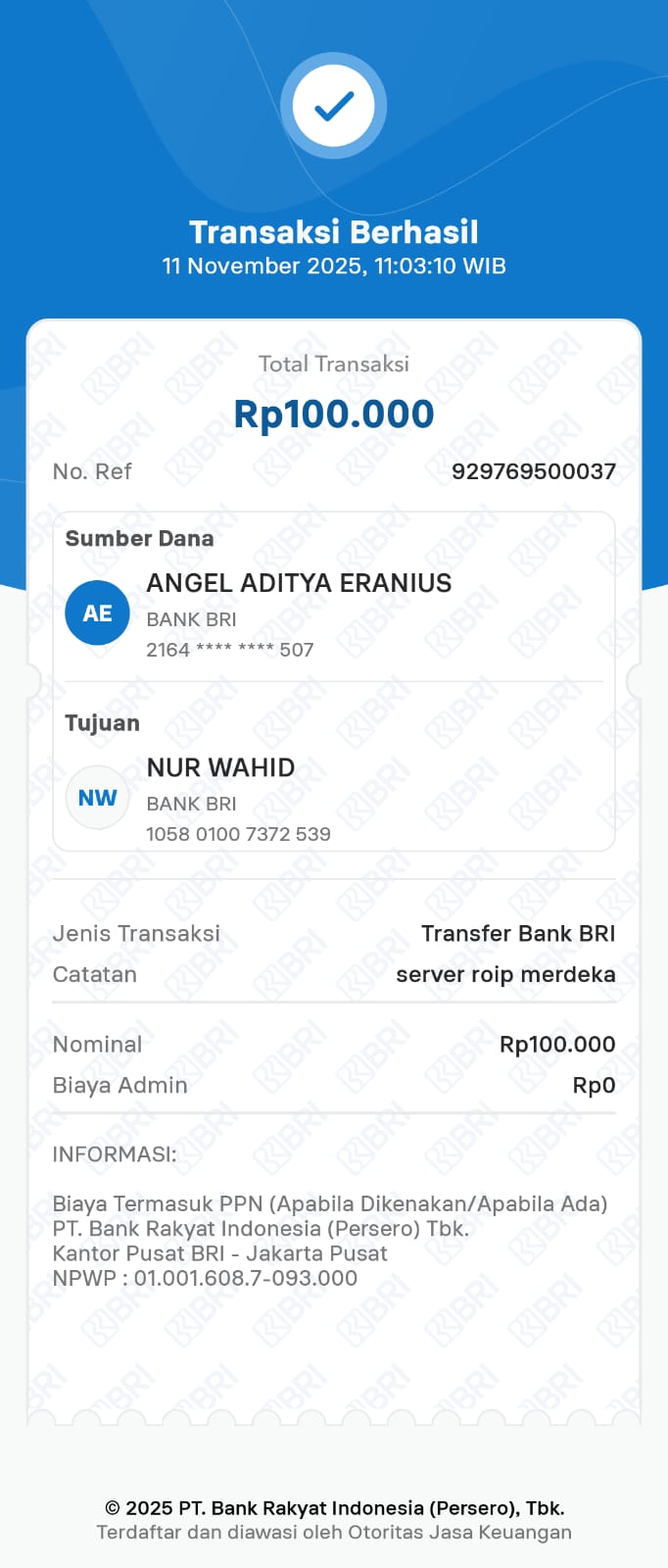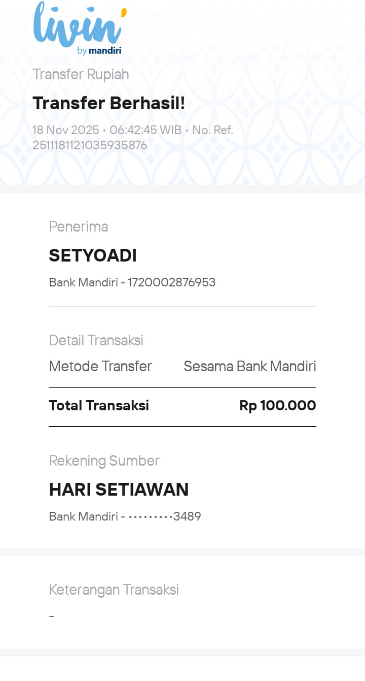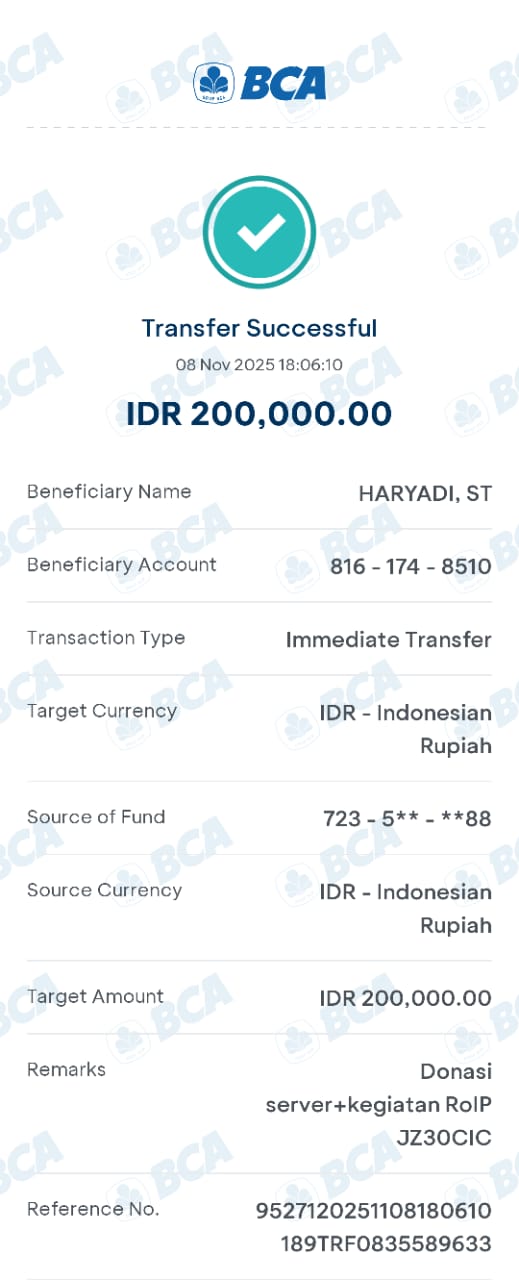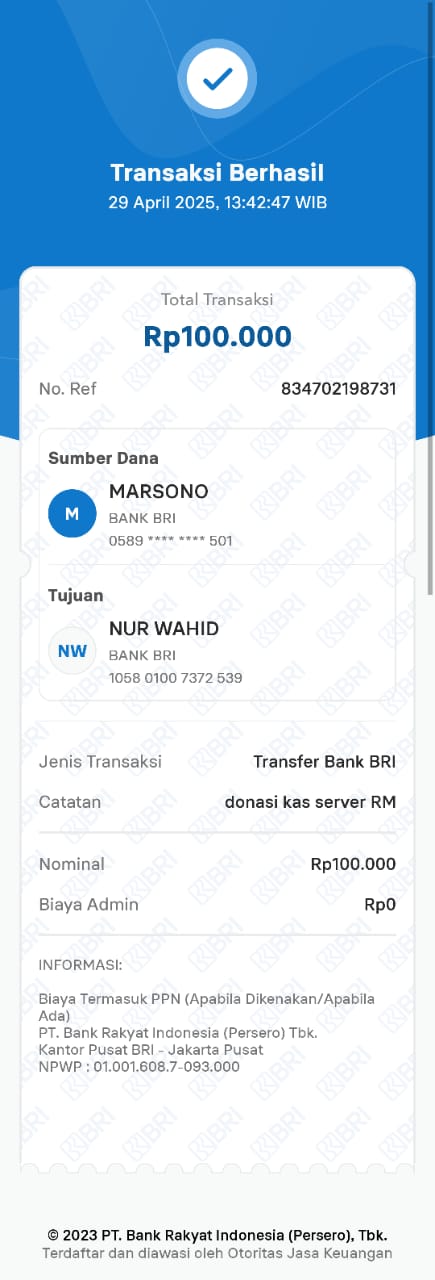 | 6 | 11-11-2025 | Rp 100.000,- | - | Donasi Server Roip Merdeka dari JZ10BZU | Ada | - |