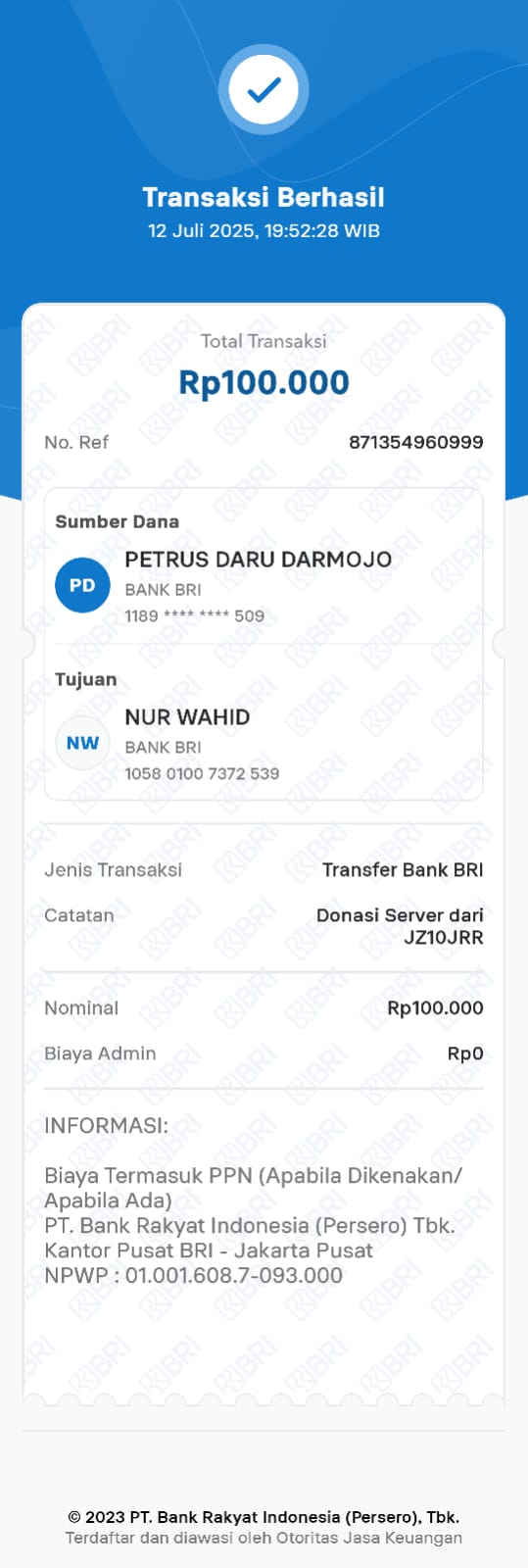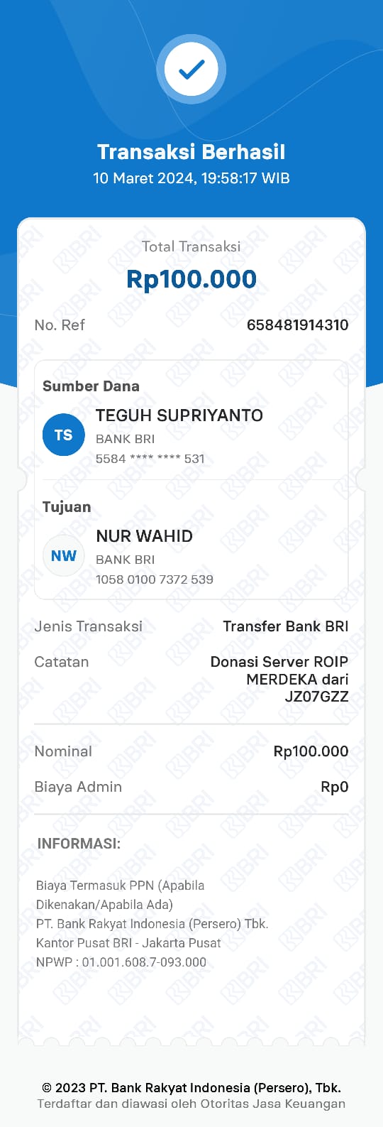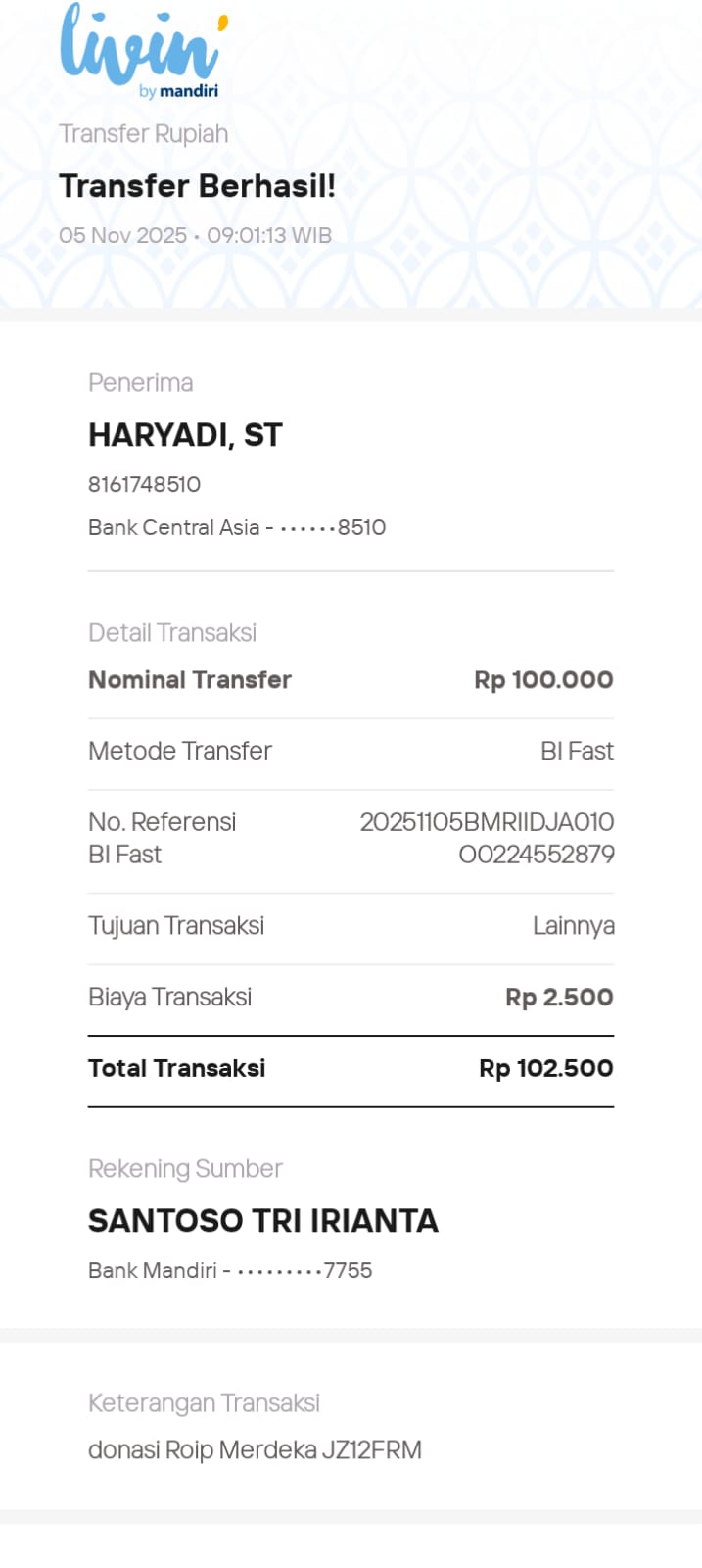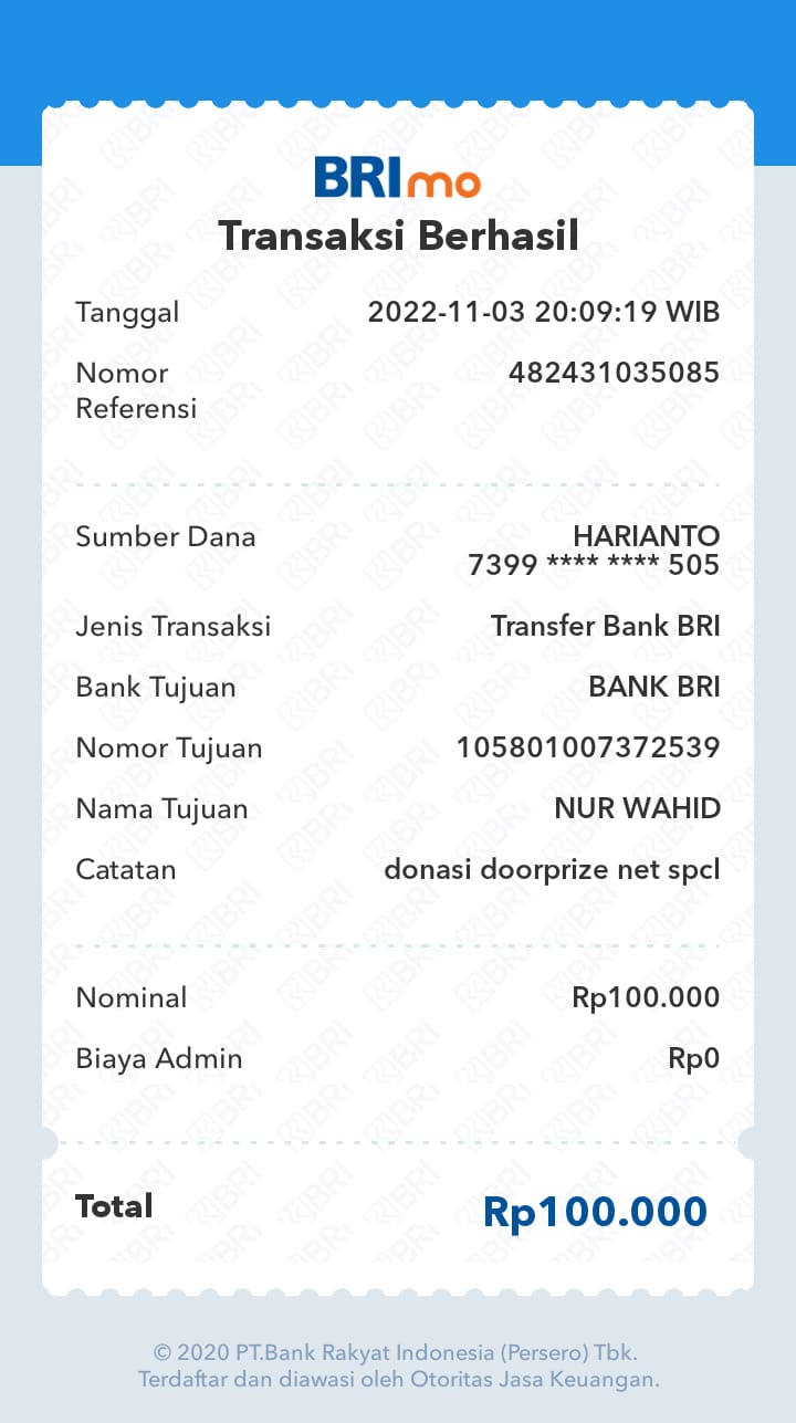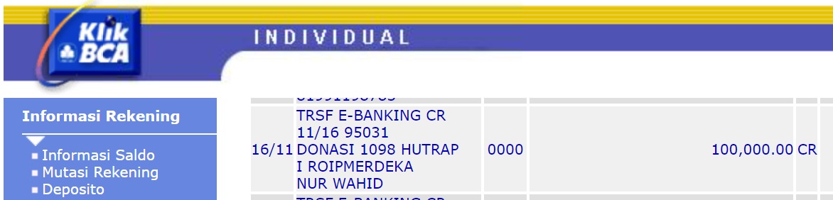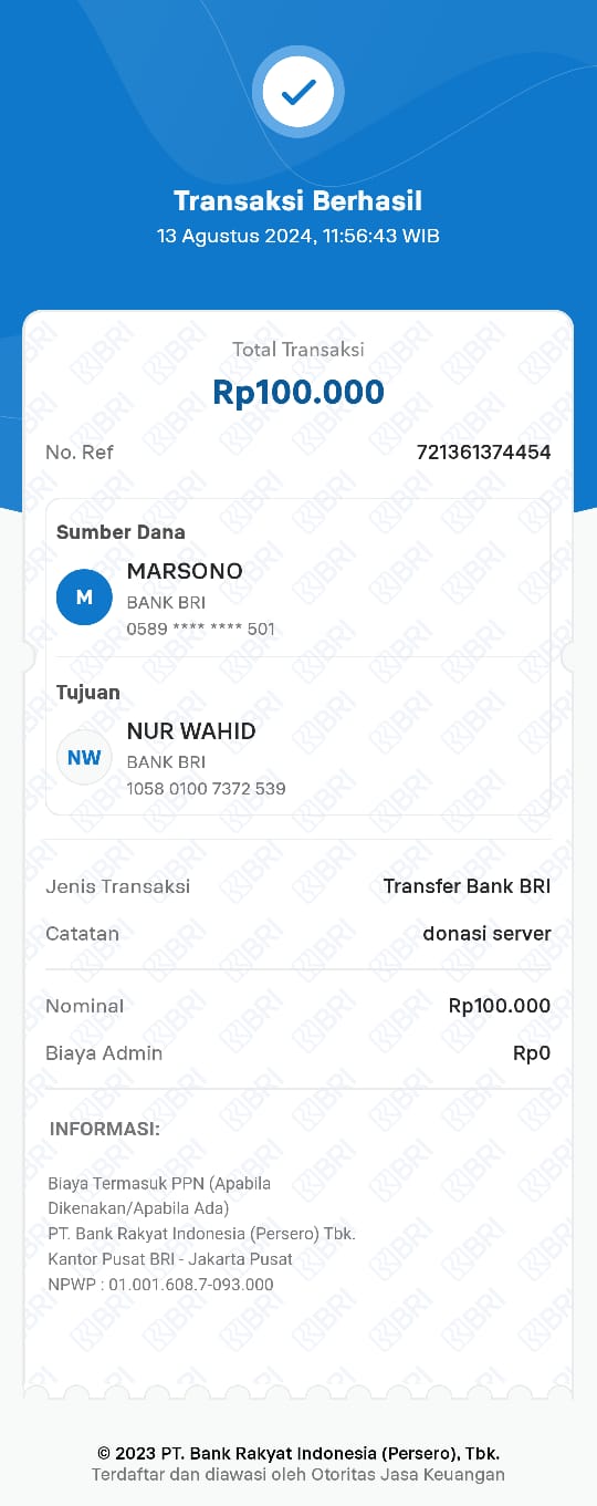 | 6 | 11-11-2025 | Rp 100.000,- | - | Donasi Server Roip Merdeka dari JZ10BZU | Ada | - |
