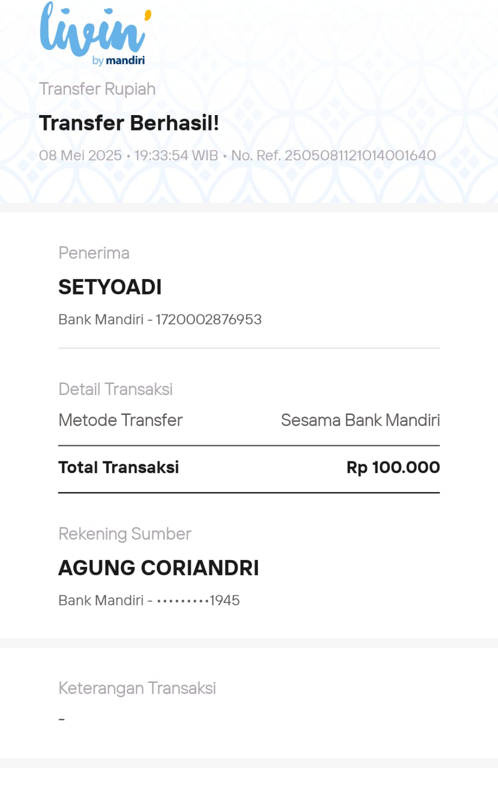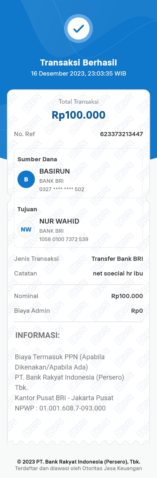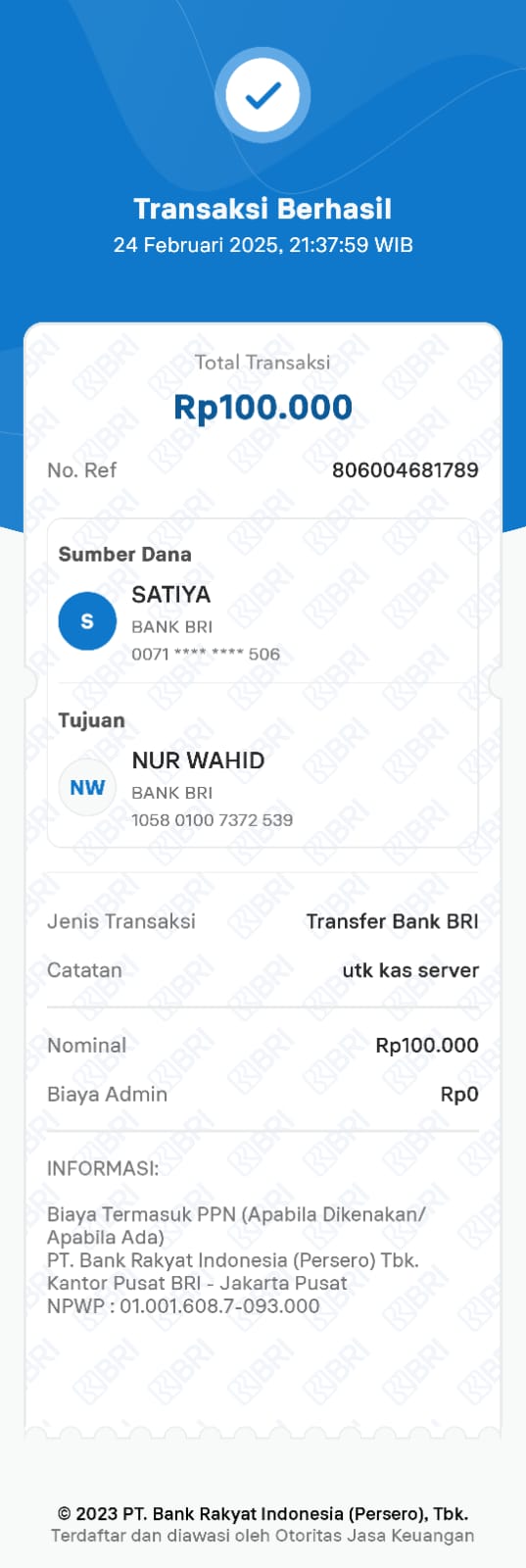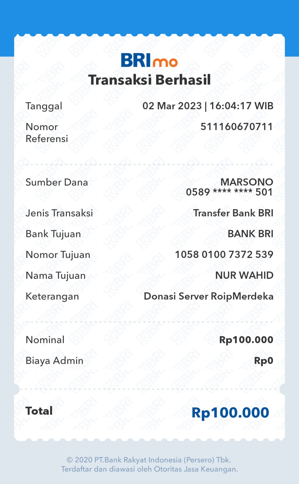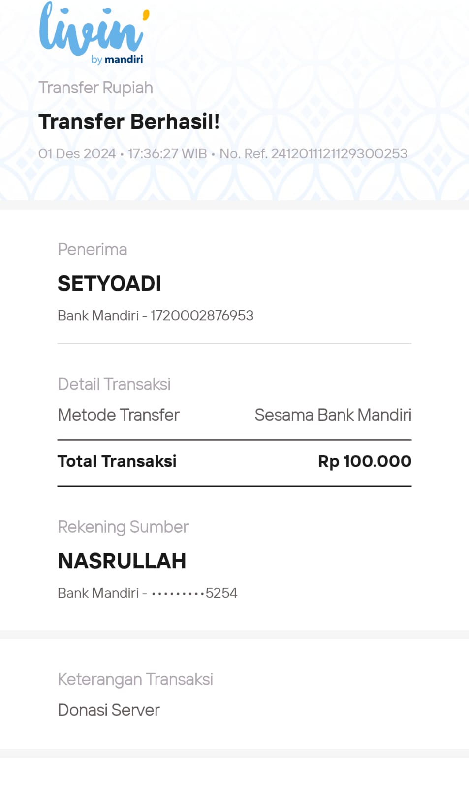 | 6 | 11-11-2025 | Rp 100.000,- | - | Donasi Server Roip Merdeka dari JZ10BZU | Ada | - |