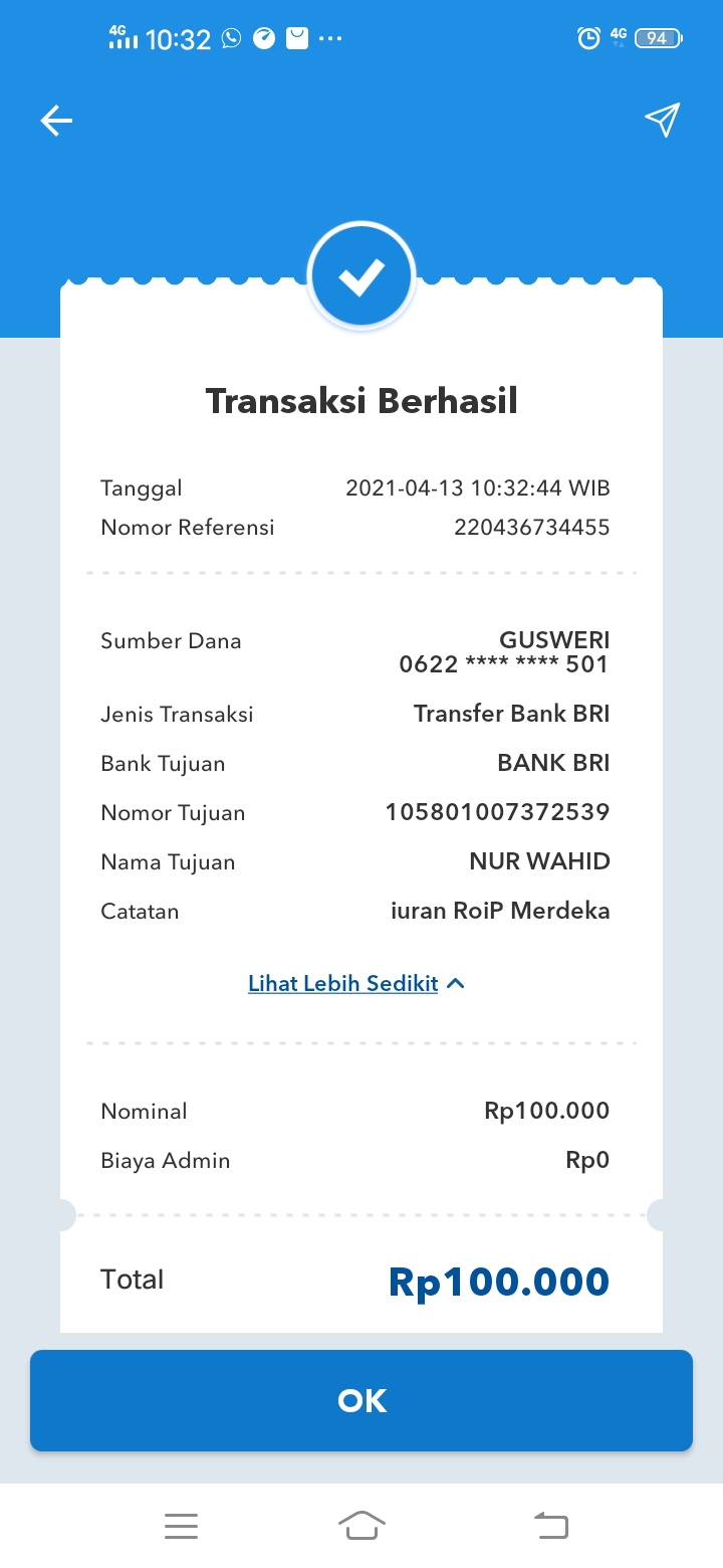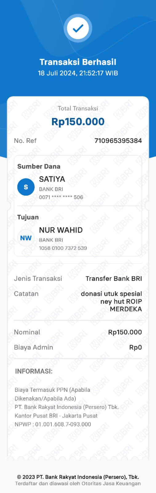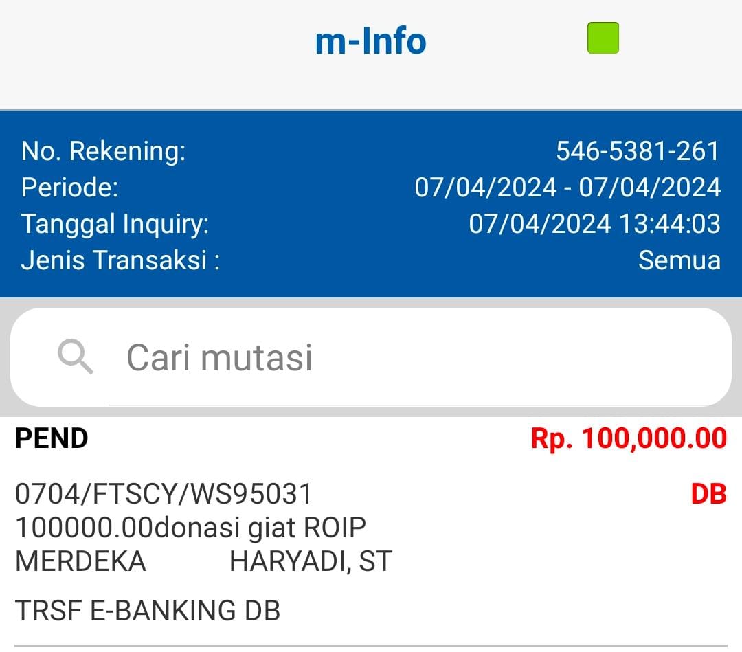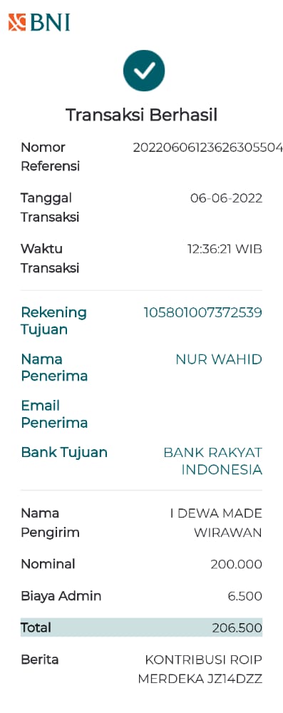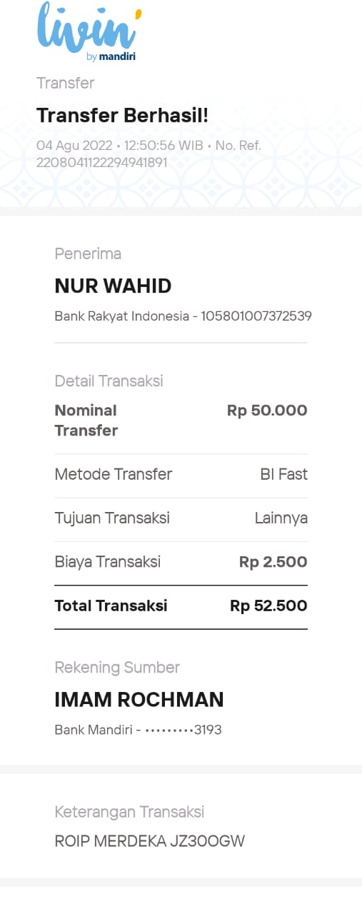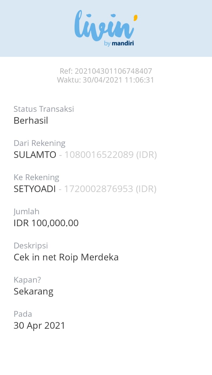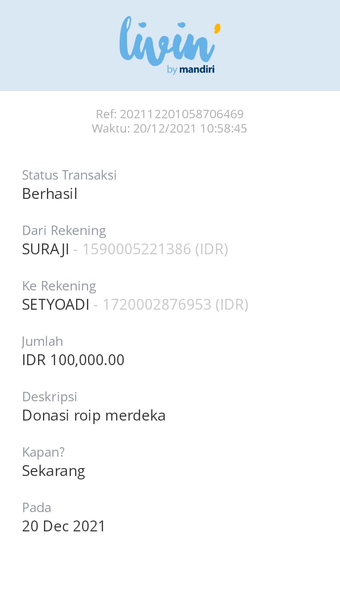 | 462 | 08-01-2021 | Rp 100.000,- | - | Donasi ROIP Merdeka, dari JZ04NUR Nur Hasan | Ada | - |