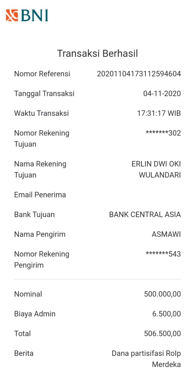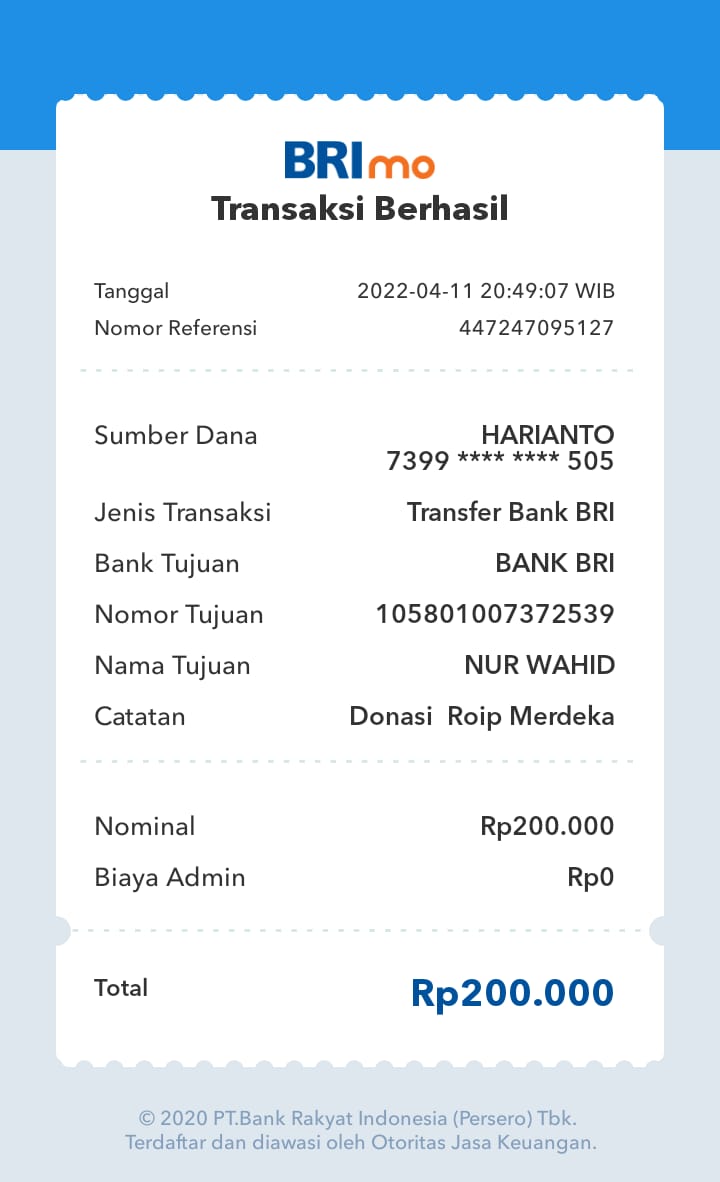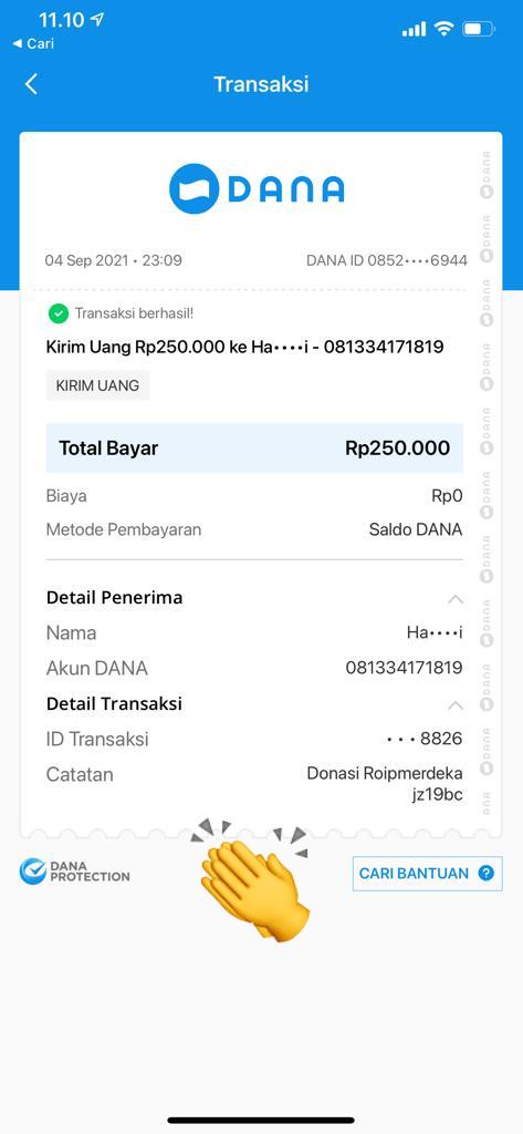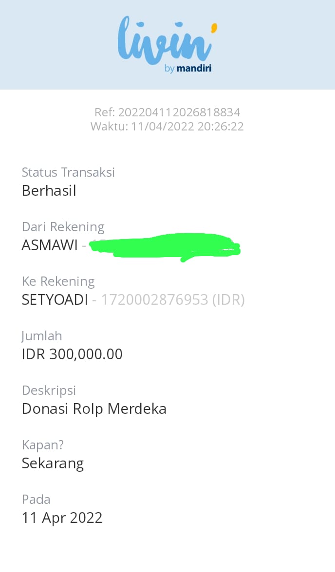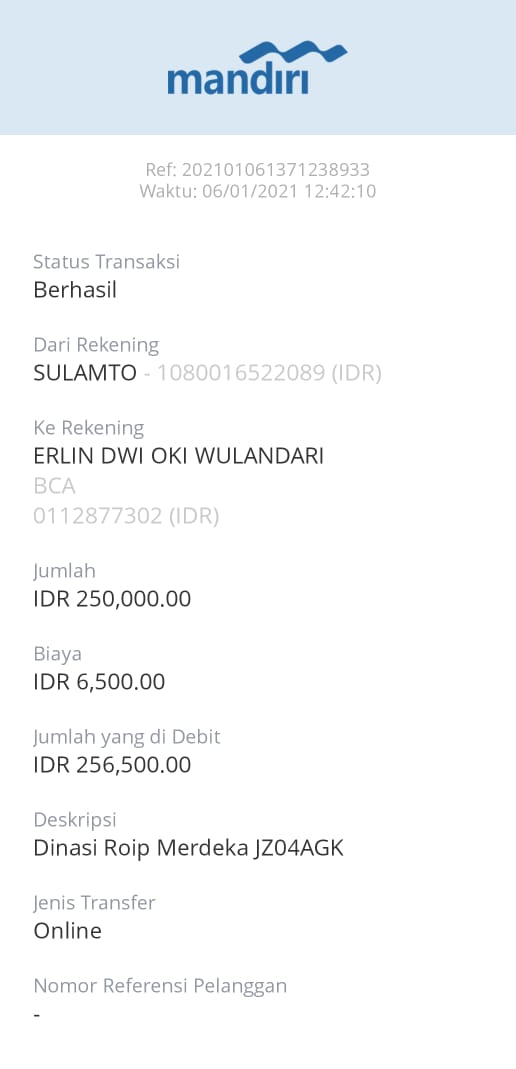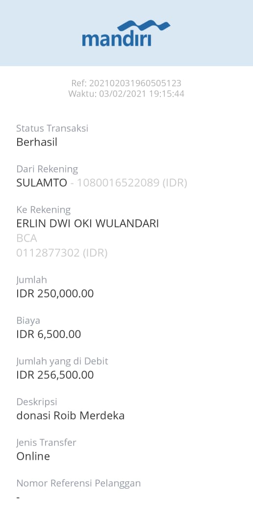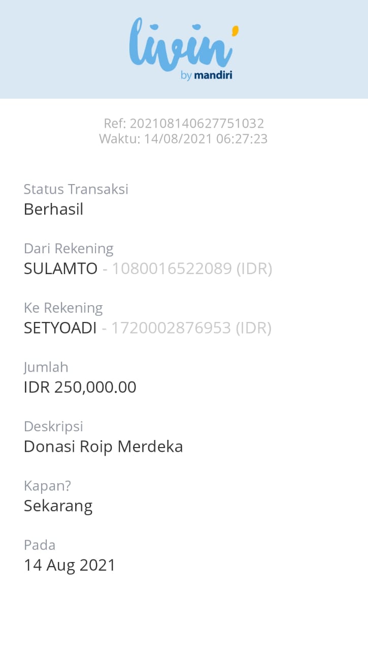 | 457 | 03-02-2021 | Rp 250.000,- | - | Donasi roip merdeka dari JZ04AGK Sulamto | Ada | - |