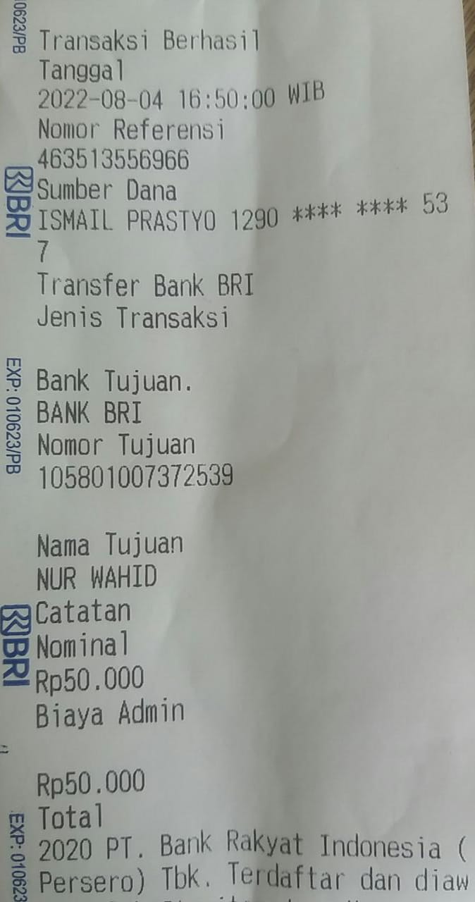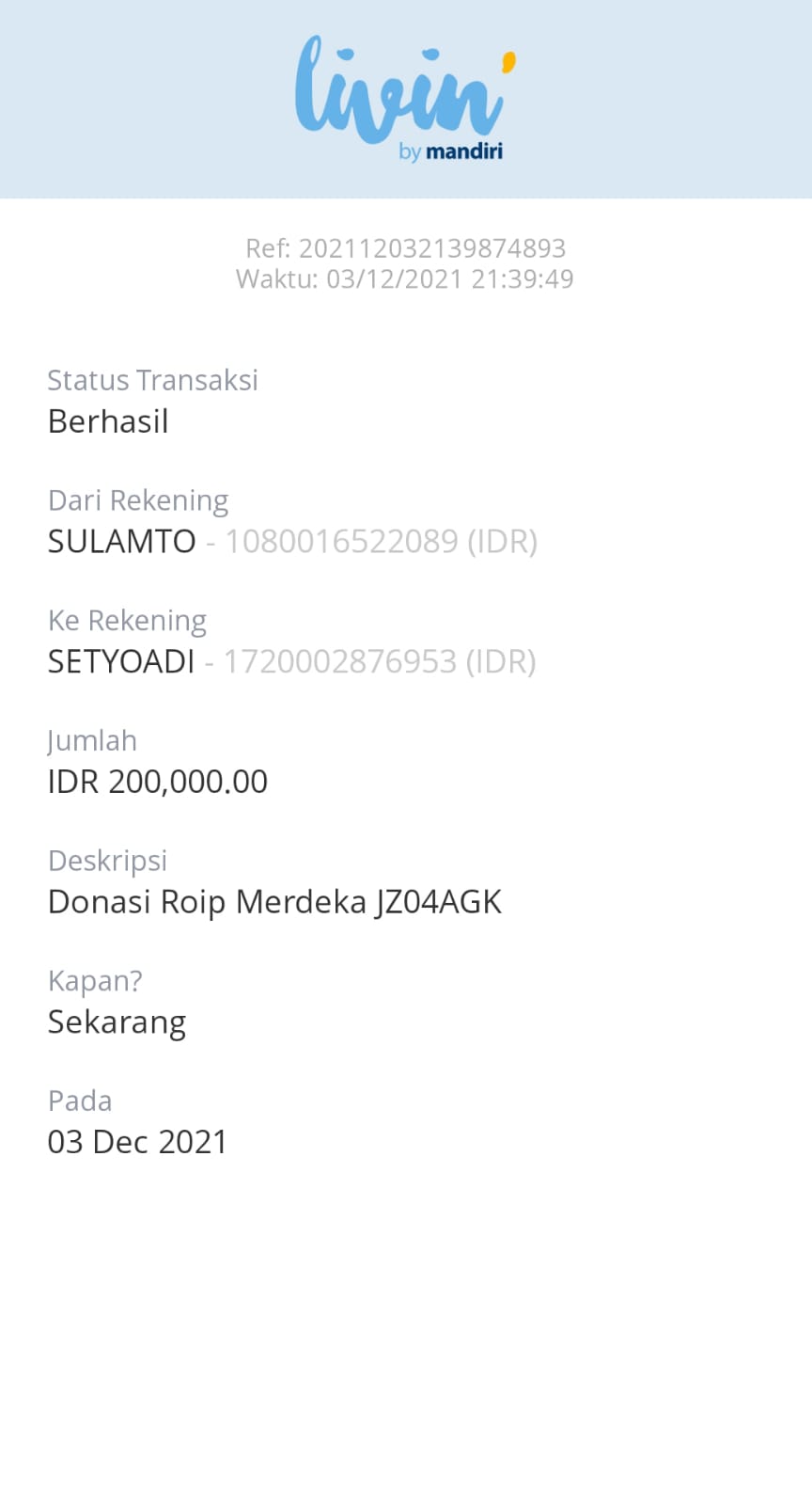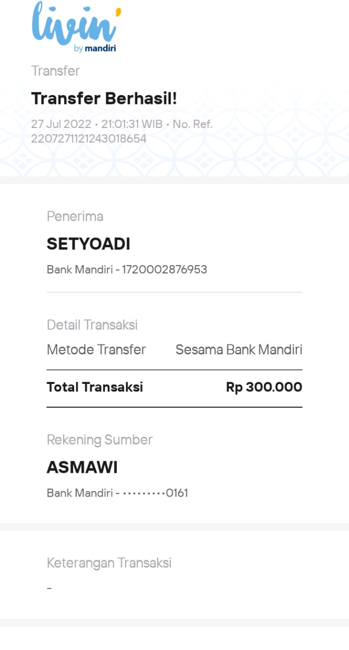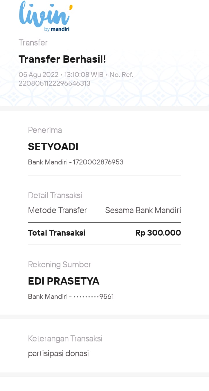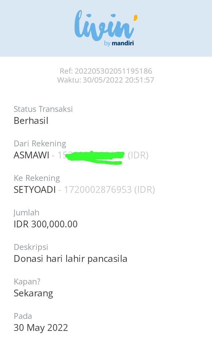 | 457 | 03-02-2021 | Rp 250.000,- | - | Donasi roip merdeka dari JZ04AGK Sulamto | Ada | - |