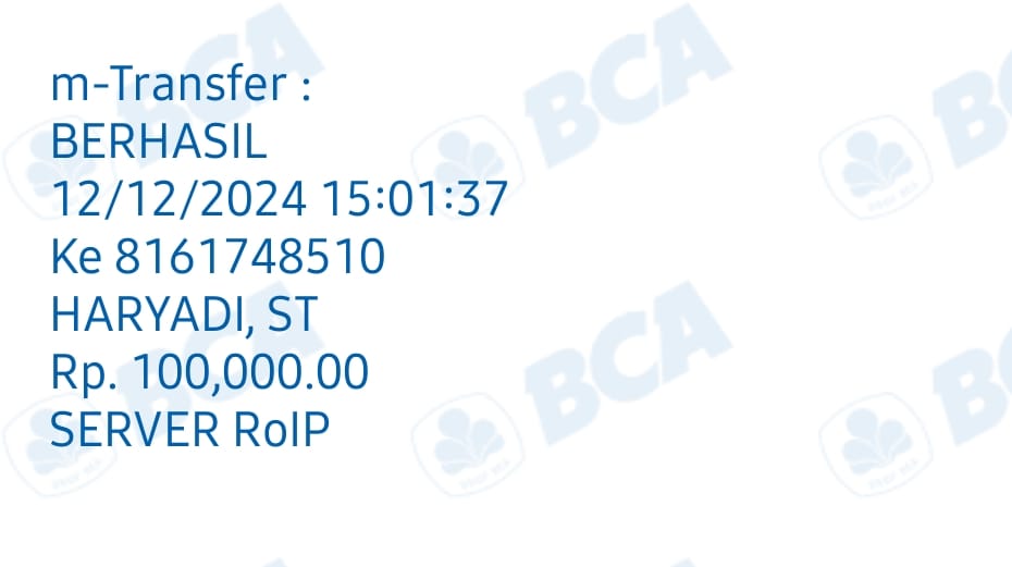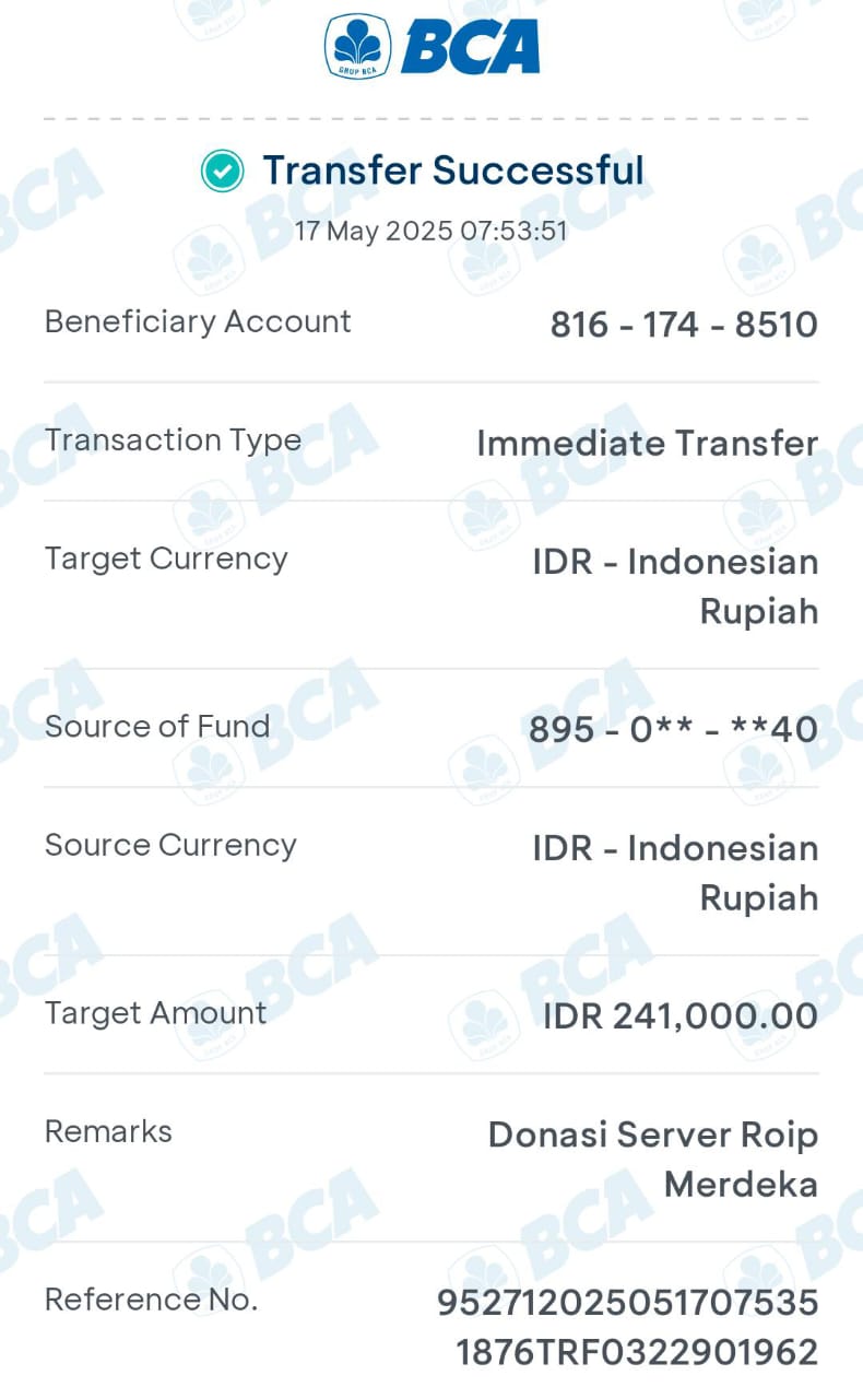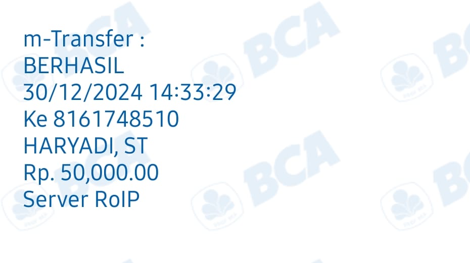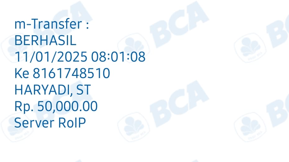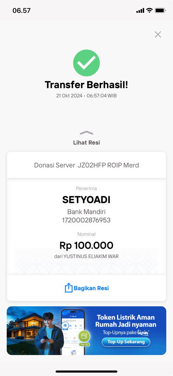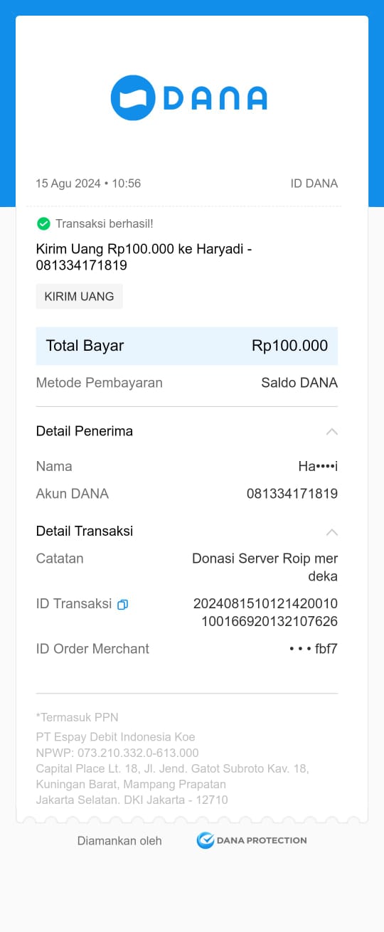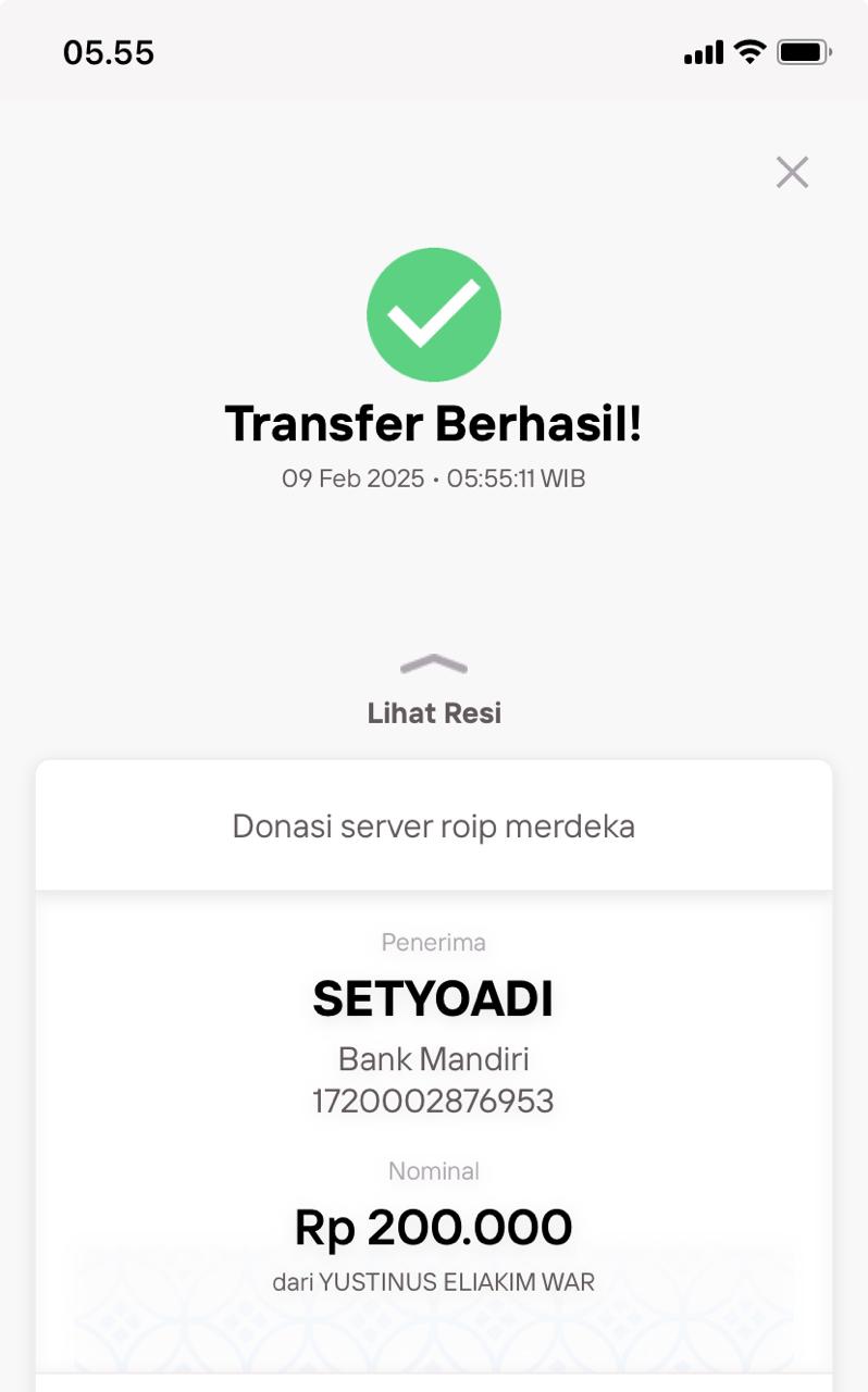 | 9 | 05-11-2025 | Rp 100.000,- | - | Donasi Server ROIP Merdeka dari JZ12FRM | Ada | - |