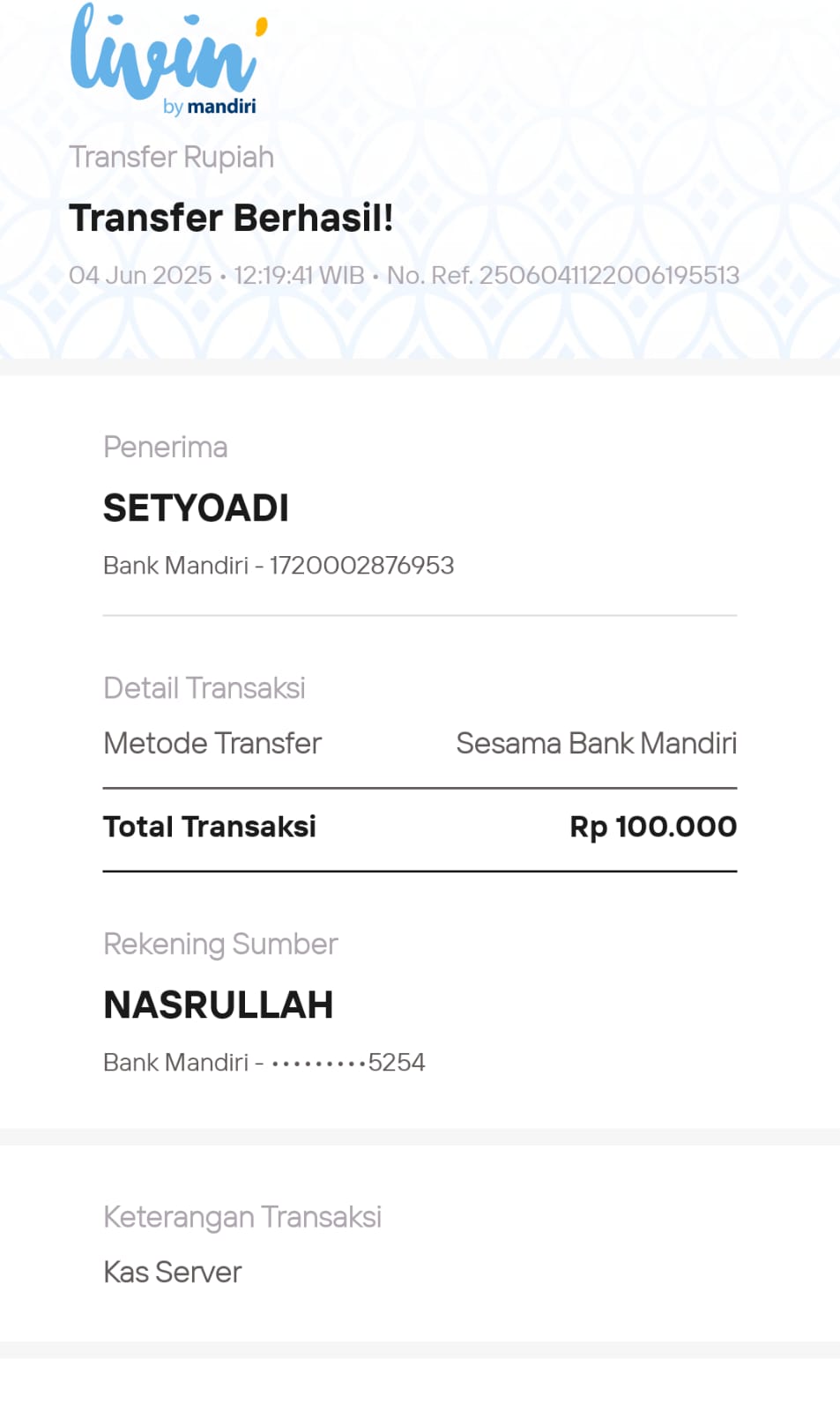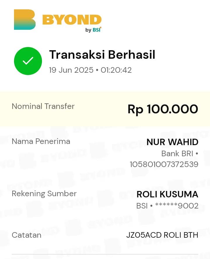 | 78 | 19-06-2025 | Rp 100.000,- | - | Donasi kas server dari JZ05ACD | Ada | - |