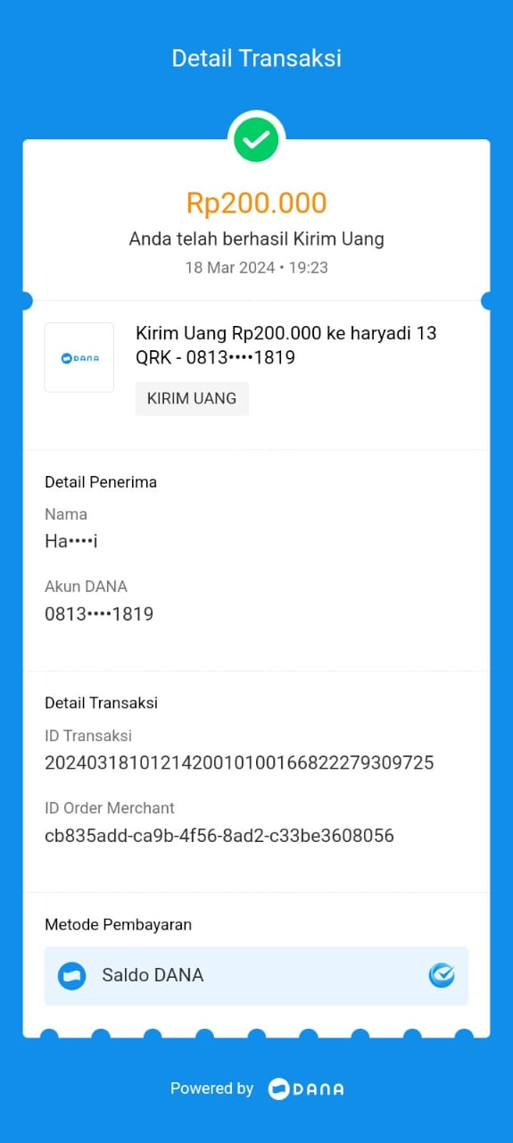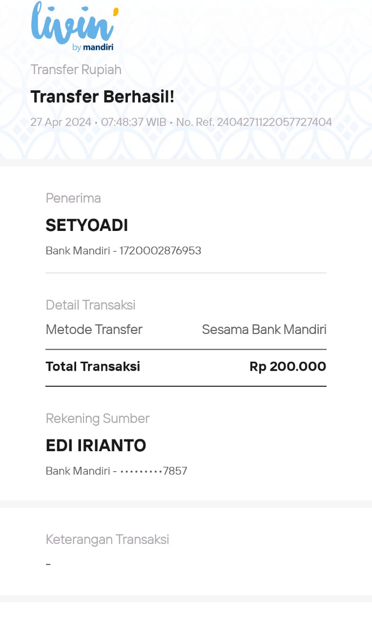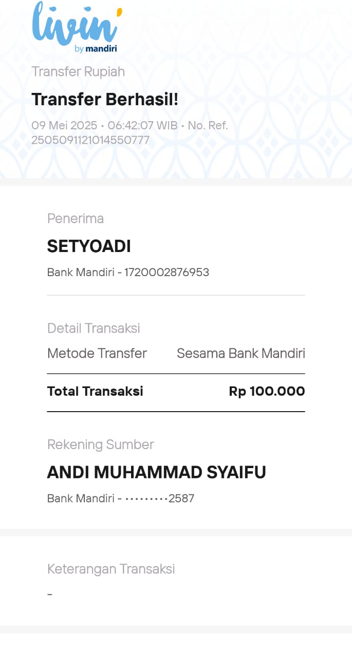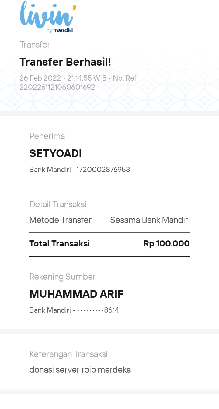 | 22 | 18-09-2025 | Rp 200.000,- | - | Donasi Server RoipMerdeka dari JZ11EFN Moh Arfani | Ada | - |