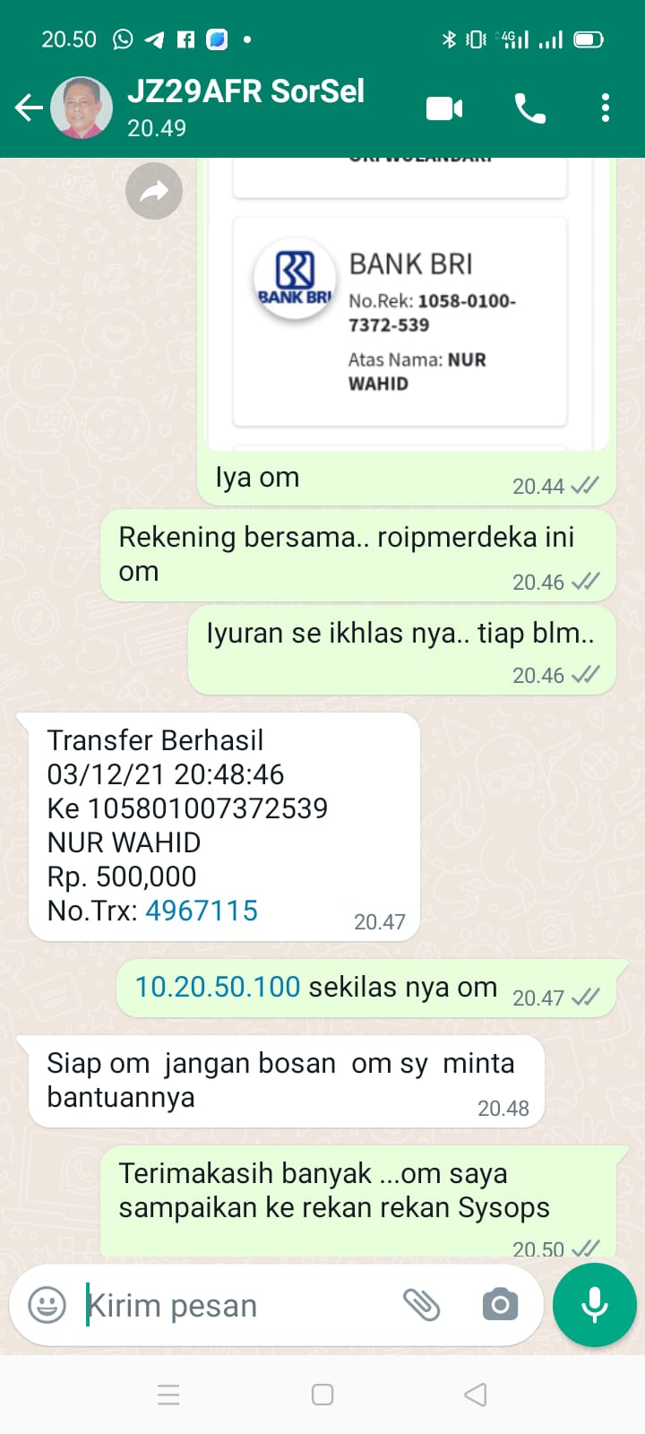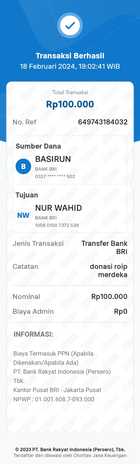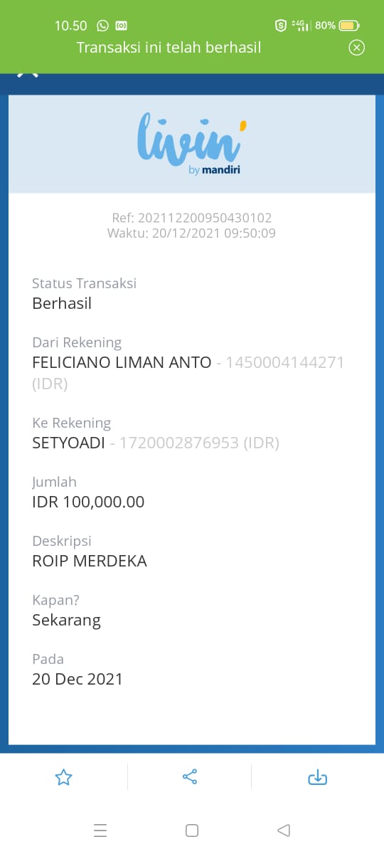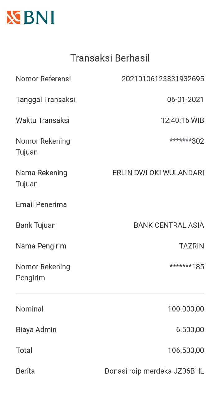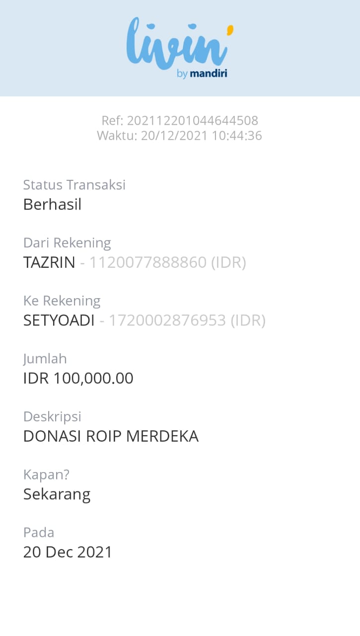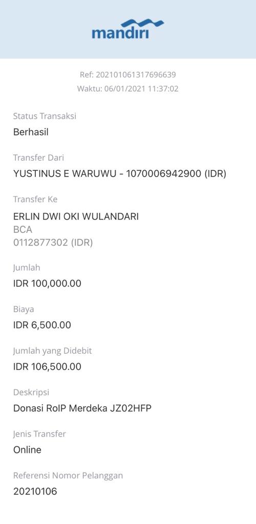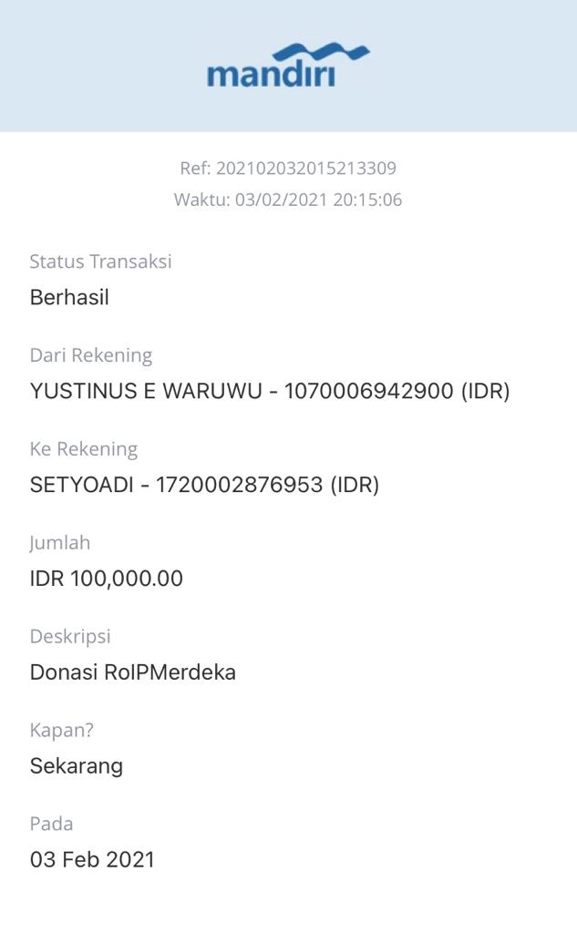 | 466 | 06-01-2021 | Rp 100.000,- | - | Donasi ROIP Merdeka dari JZ06BHL NORMAN JAYA | Ada | - |