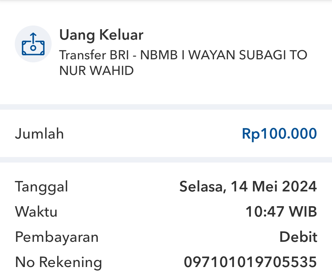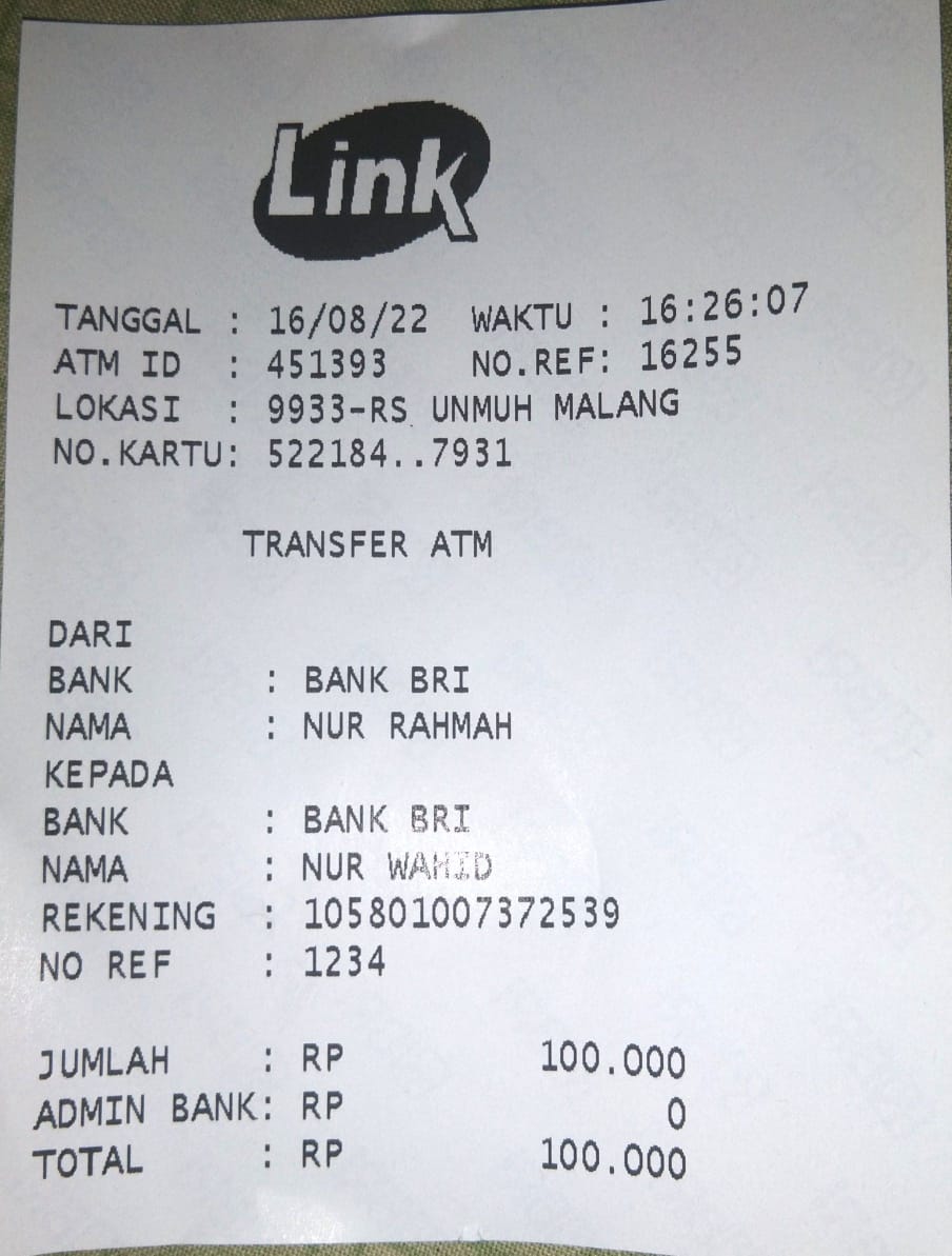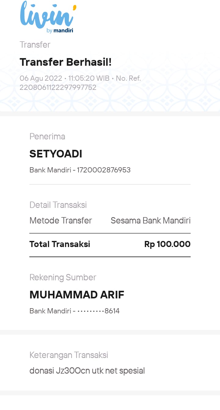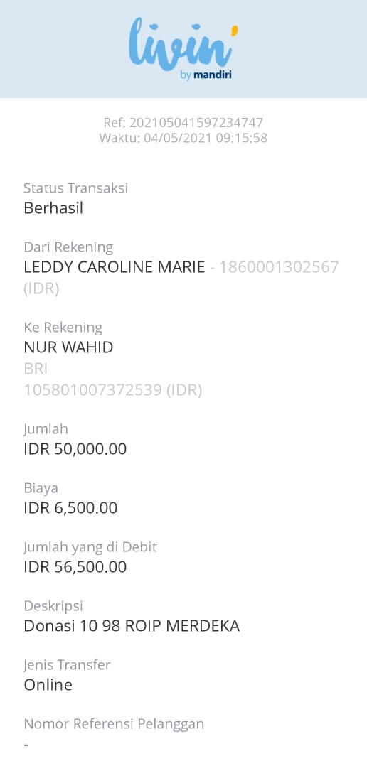 | 432 | 10-05-2021 | Rp 100.000,- | - | Donasi untuk Roip Merdeka dari JZ13XBC Bpk A Nur Qoyim | Ada | - |