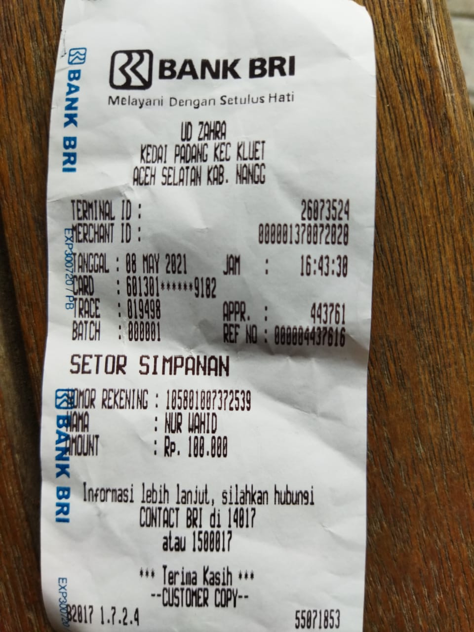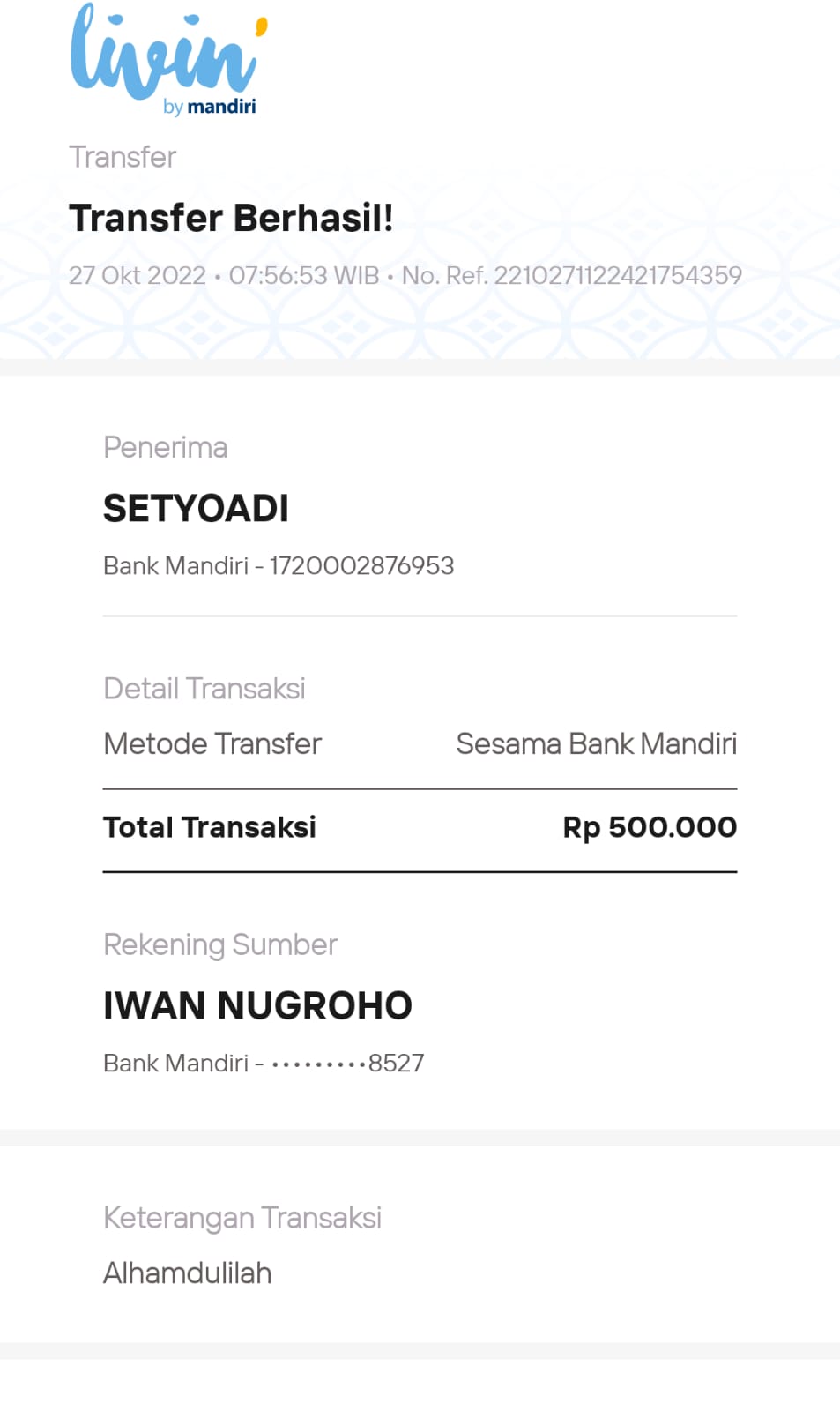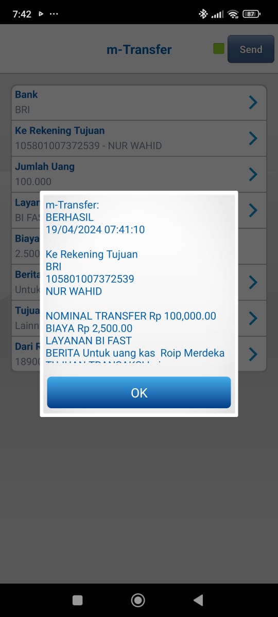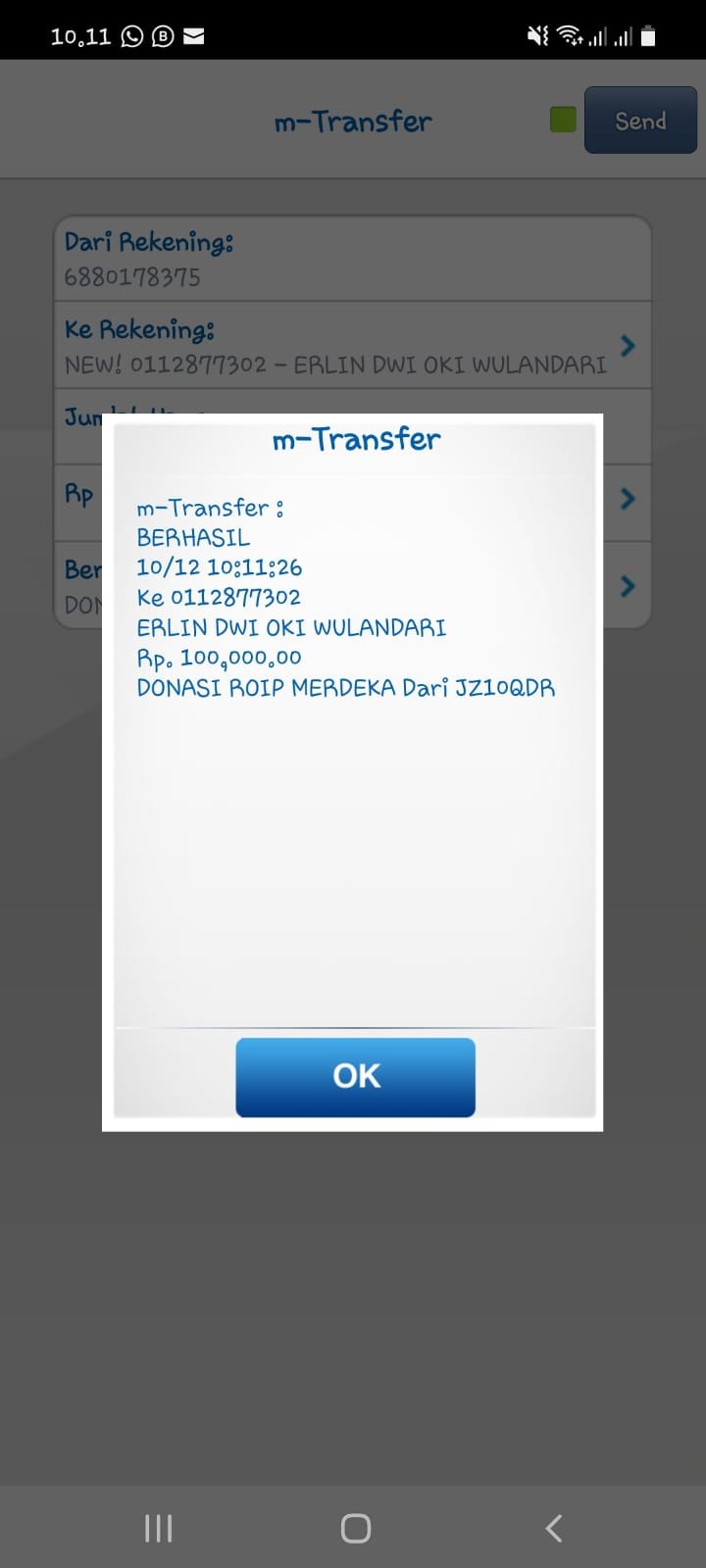 | 432 | 10-05-2021 | Rp 100.000,- | - | Donasi untuk Roip Merdeka dari JZ13XBC Bpk A Nur Qoyim | Ada | - |