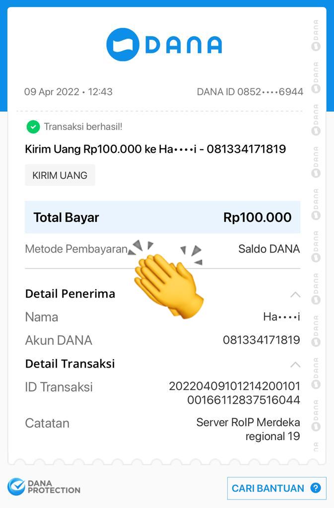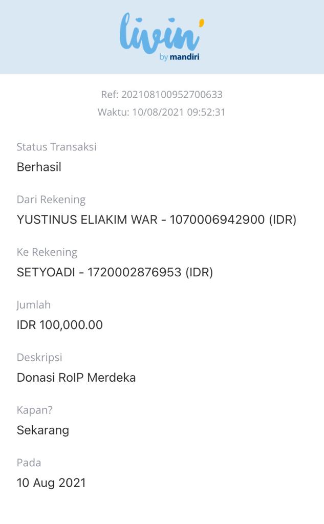 | 430 | 10-08-2021 | Rp 100.000,- | - | Donasi Server Roip Merdeka dari JZ02HFP bang Yustinus | Ada | - |