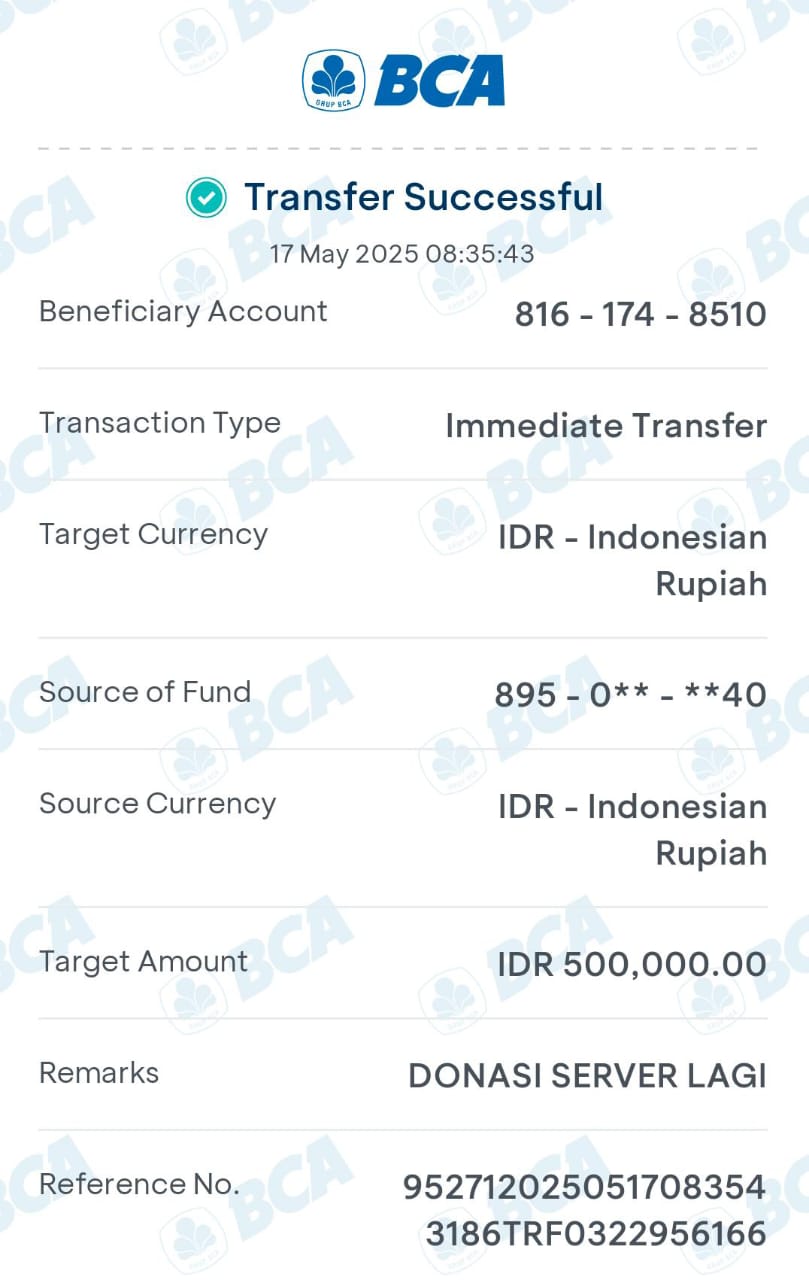 | 84 | 17-05-2025 | Rp 500.000,- | - | Donasi kas server dari JZ12BQM | Ada | - |