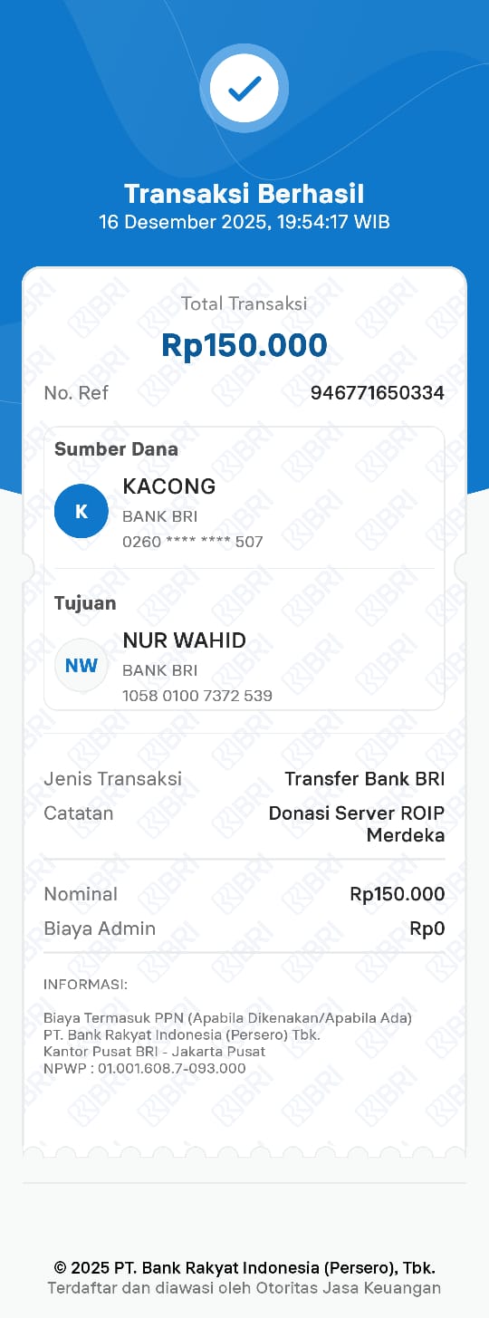 | 7 | 16-12-2025 | Rp 250.000,- | - | Donasi Server ROIP MERDEKA dari JZ18ACN | Ada | - |