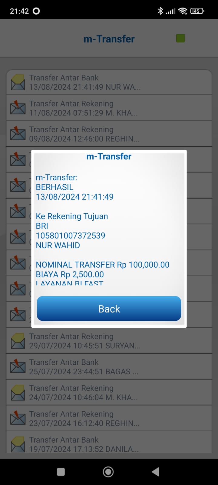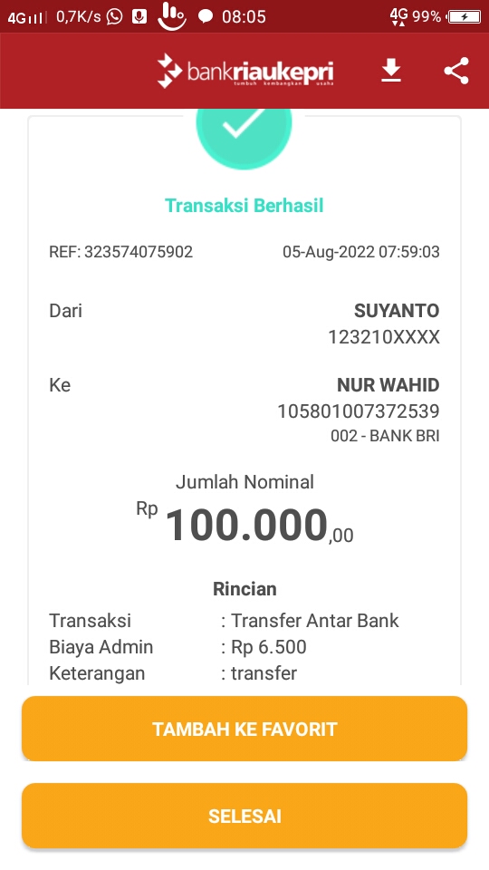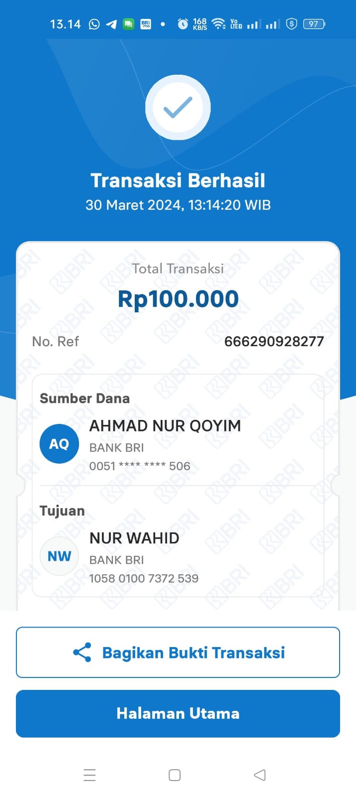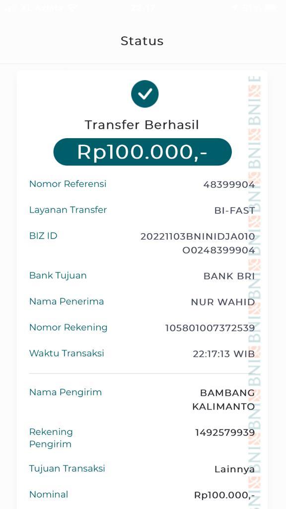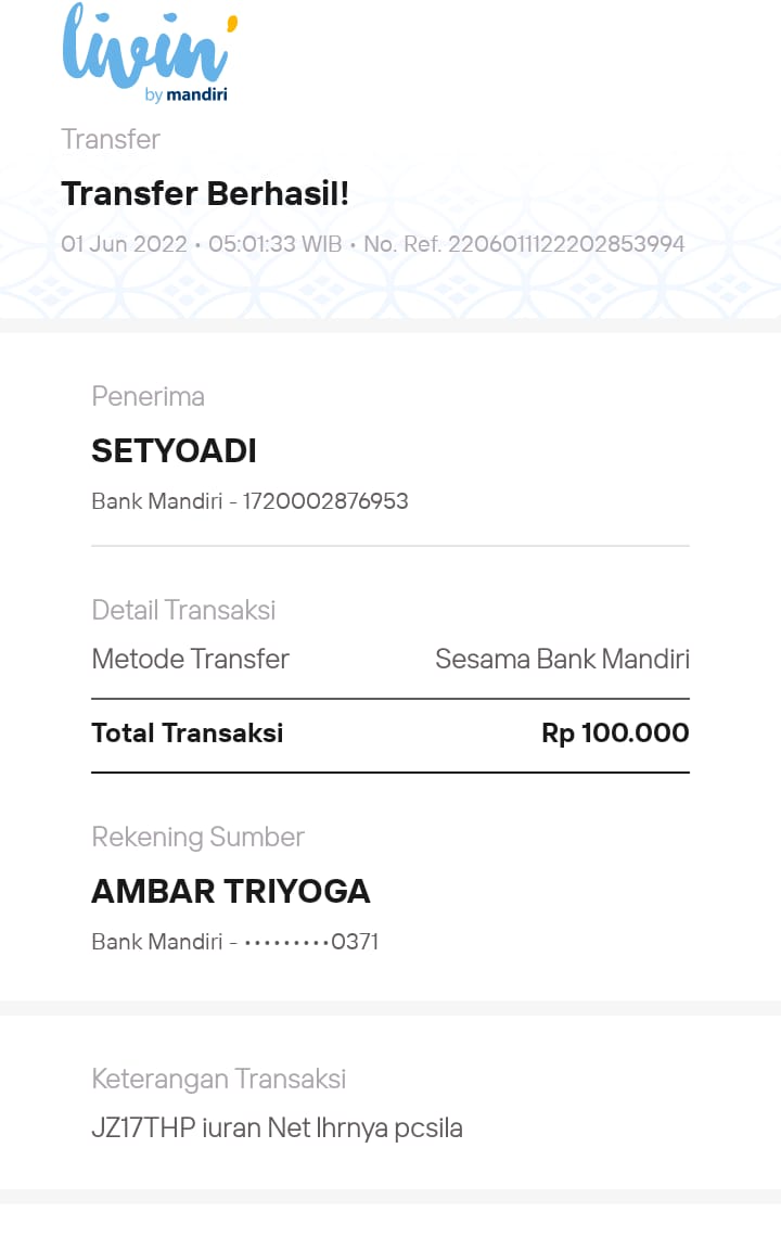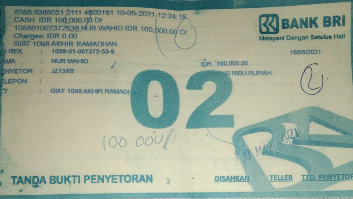 | 433 | 10-05-2021 | Rp 100.000,- | - | Donasi untuk 10-98 Spesial Ramadhan dari JZ13XBC Bpk A Nur Qoyim | Ada | - |