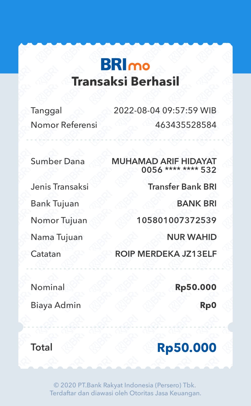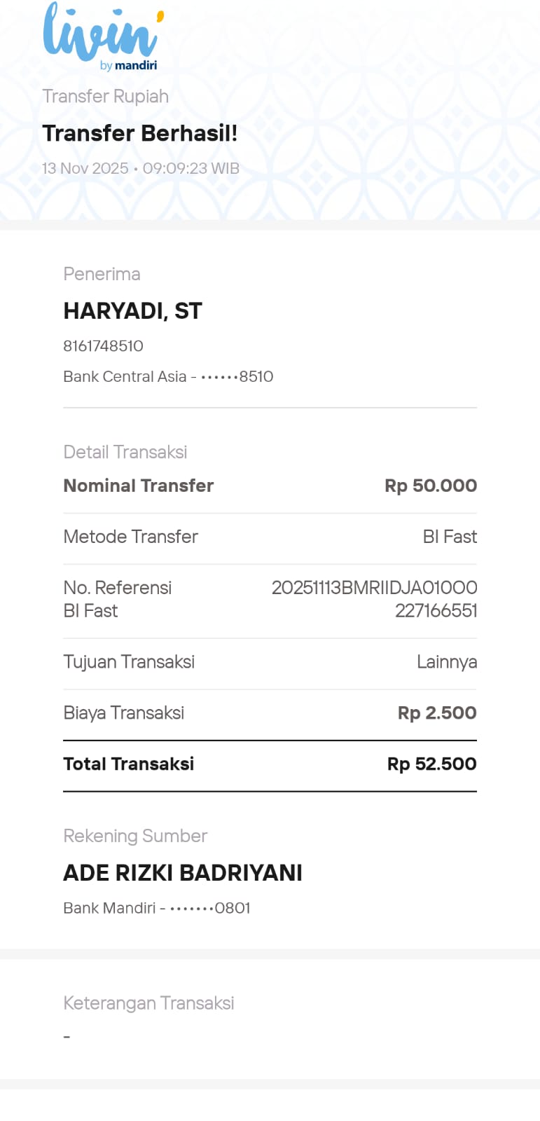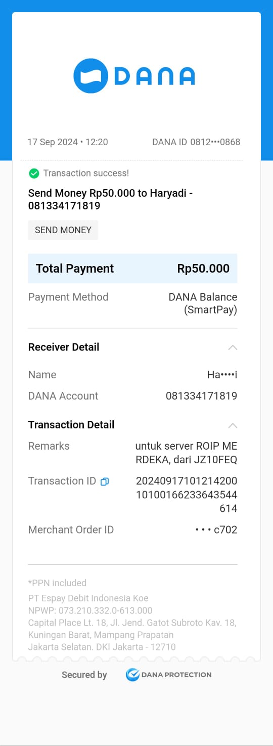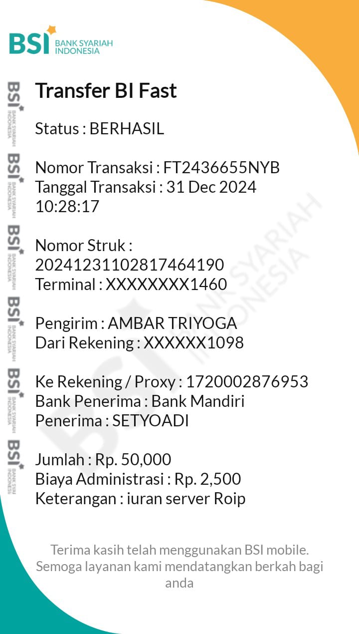 | 3 | 13-11-2025 | Rp 50.000,- | - | Donasi Server RoipMerdeka dari JZ09AKI | Ada | - |