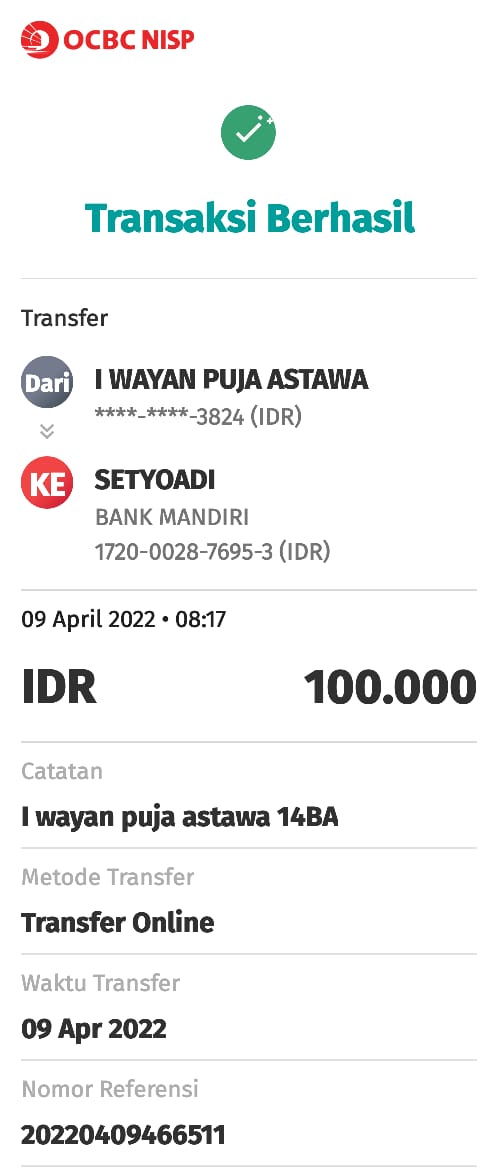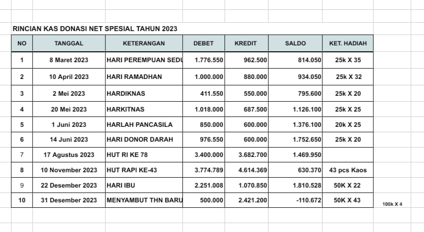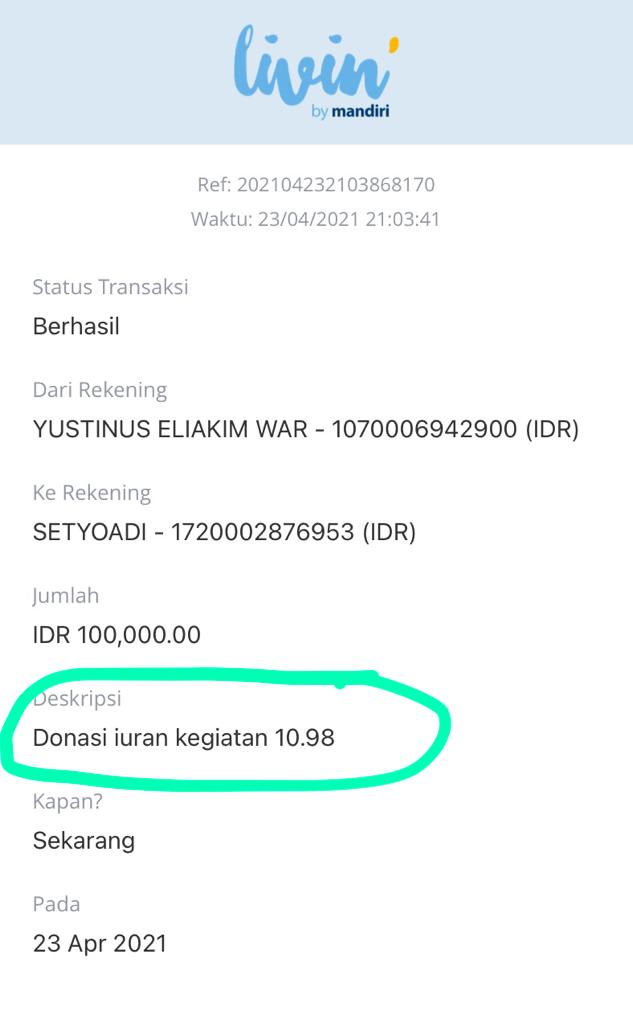 | 448 | 23-04-2021 | Rp 100.000,- | - | Donasi untuk 10-98 Spesial Ramadhan dari JZ02FHP bang Yustinus | Ada | - |