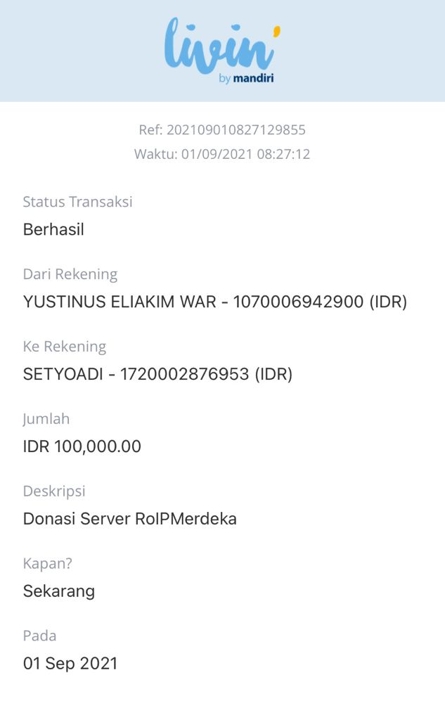 | 424 | 01-09-2021 | Rp 100.000,- | - | Donasi server ROIP Merdeka dari JZ02HFP bang Yustinus | Ada | - |