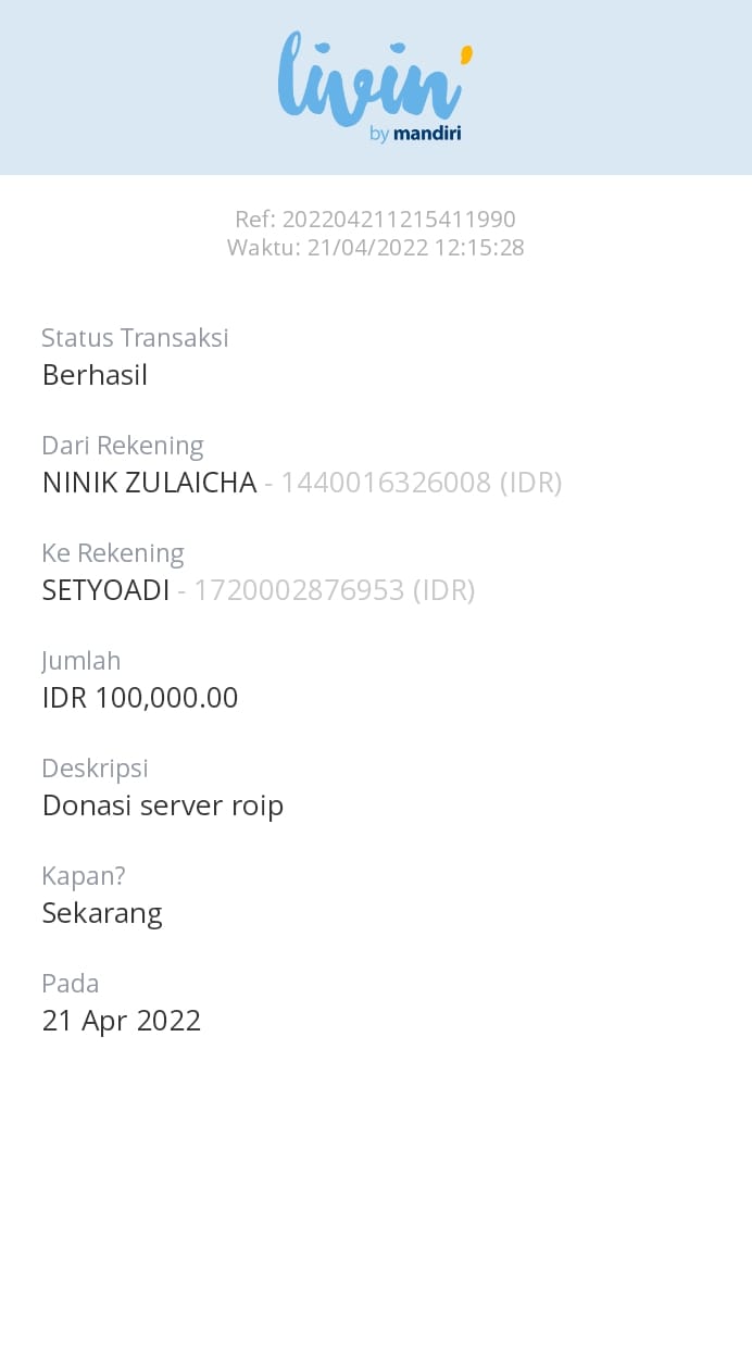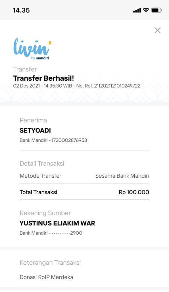 | 422 | 02-12-2021 | Rp 100.000,- | - | Donasi untuk Server Roip Merdeka dari JZ02HFP bang Yustinus | Ada | - |
