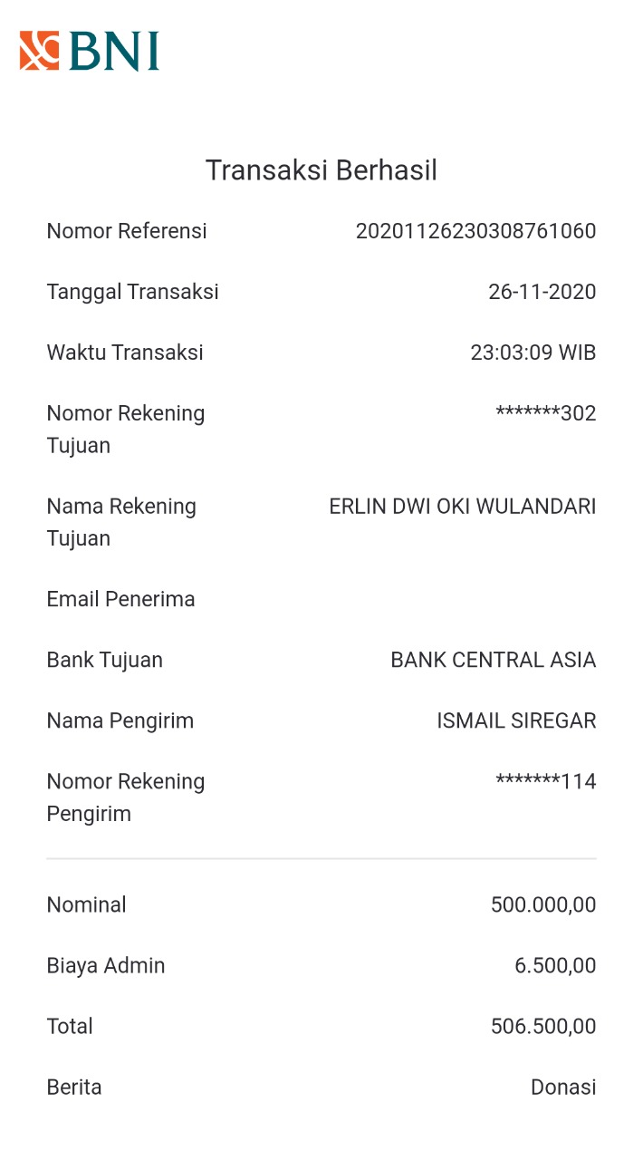 | 487 | 26-11-2020 | Rp 500.000,- | - | Donasi dari JZ04FIS, Ismail Siregar | Ada | - |