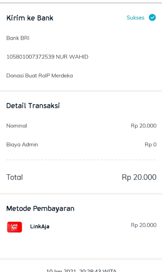 | 460 | 10-01-2021 | Rp 10.000,- | - | Donasi untuk ROIP Merdeka dari JZ19JCR | Ada | - |