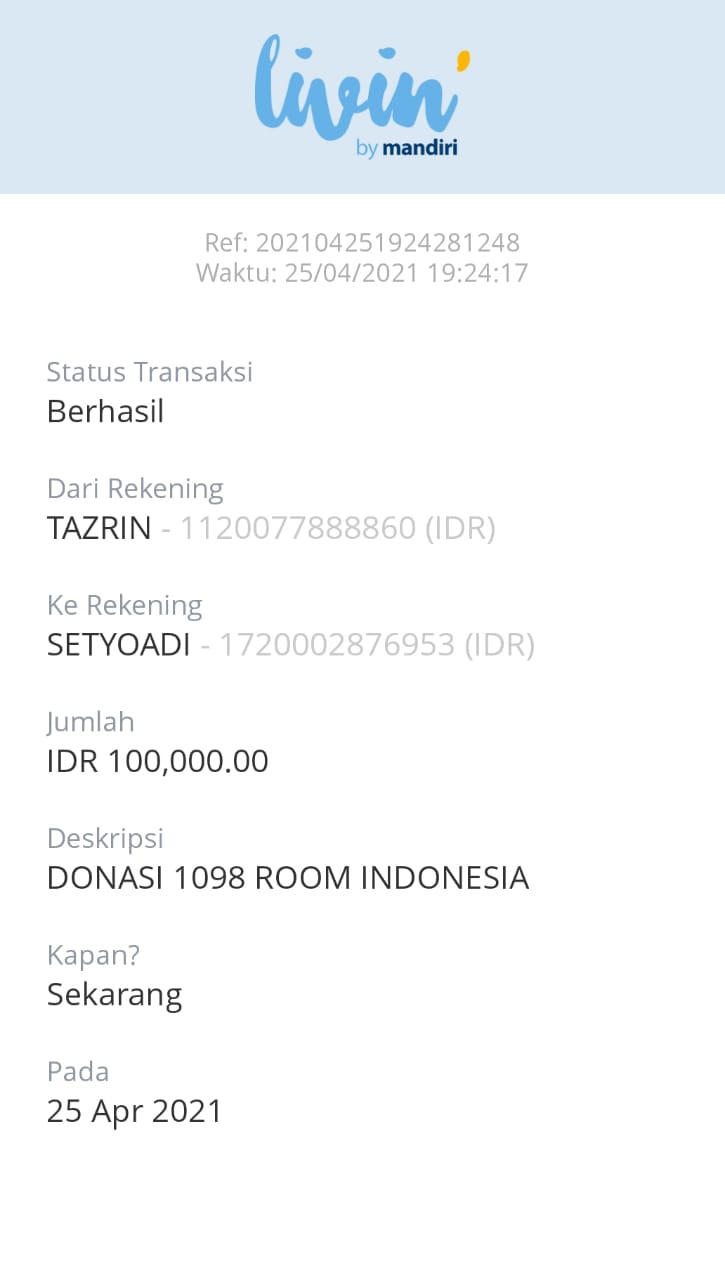 | 445 | 25-04-2021 | Rp 100.000,- | - | Donasi untuk 10-98 Spesial Ramadhan dari JZ06BGR | Ada | - |