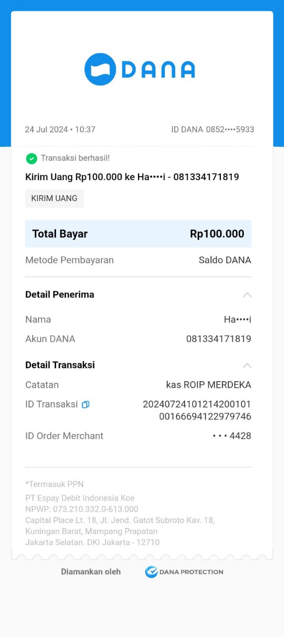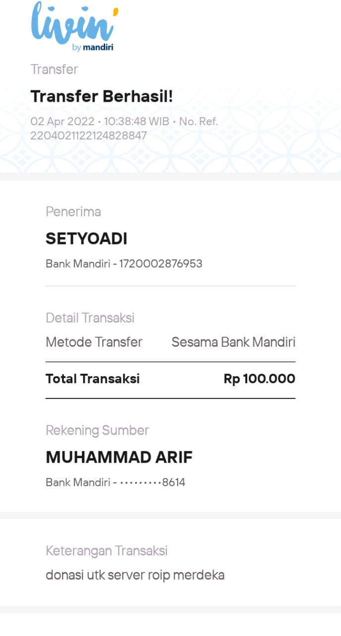 | 4 | 11-11-2025 | Rp 100.000,- | - | Donasi Server RoipMerdeka dari JZ12BVM | Ada | - |