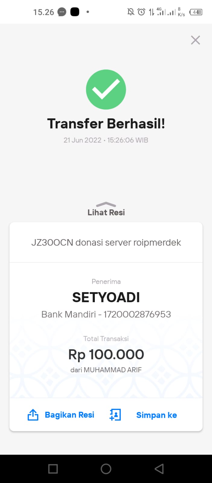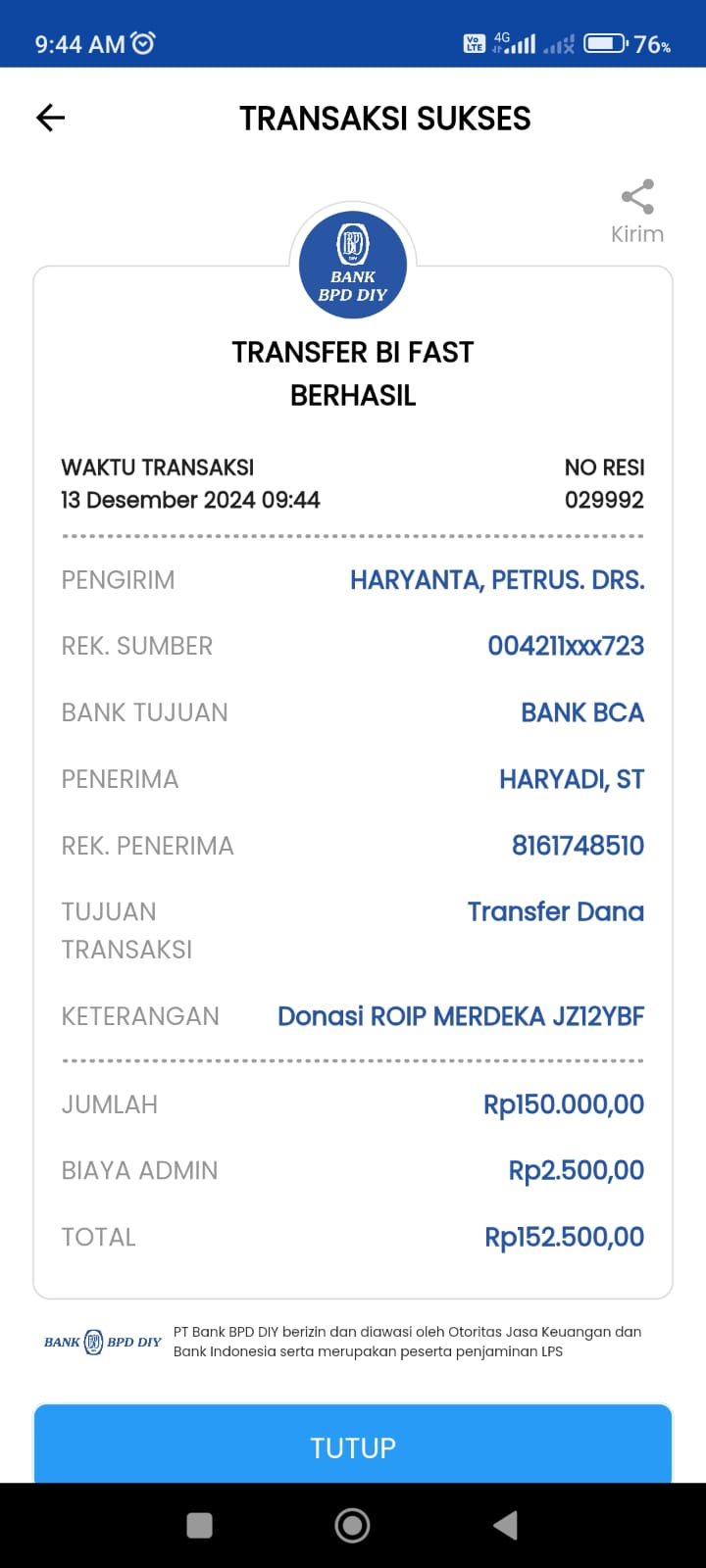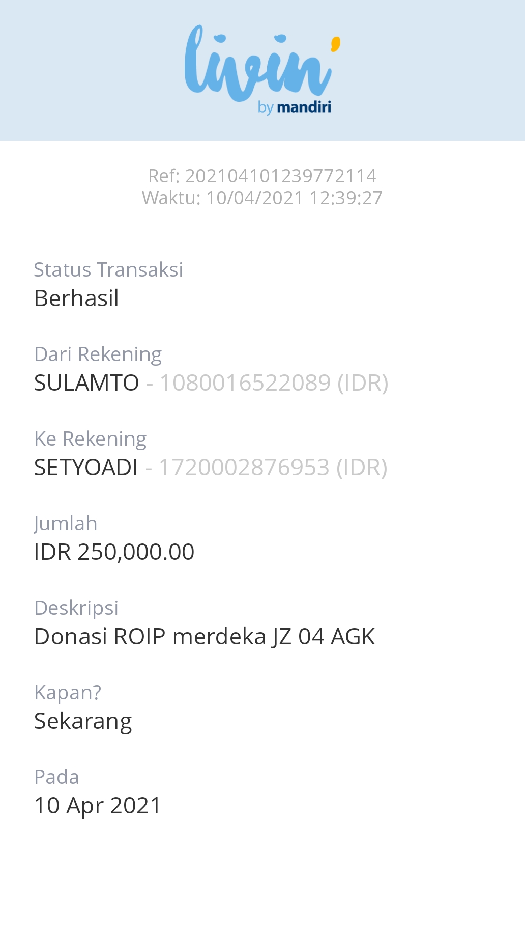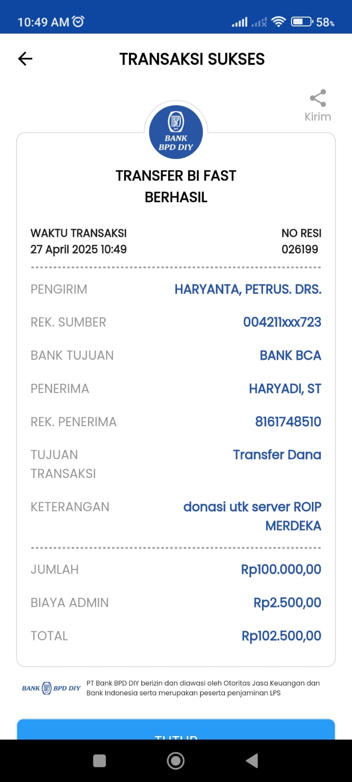 | 452 | 10-04-2021 | Rp 250.000,- | - | Donasi untuk ROIP Merdeka dari JZ04AGK, Om Sulamto (Anto Lybaz) | Ada | - |