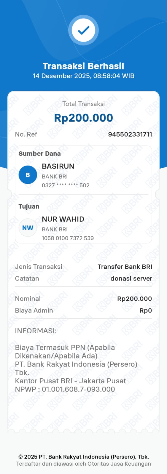 | 10 | 14-12-2025 | Rp 200.000,- | - | Donasi Server ROIP MERDEKA dari JZ11WOT | Ada | - |