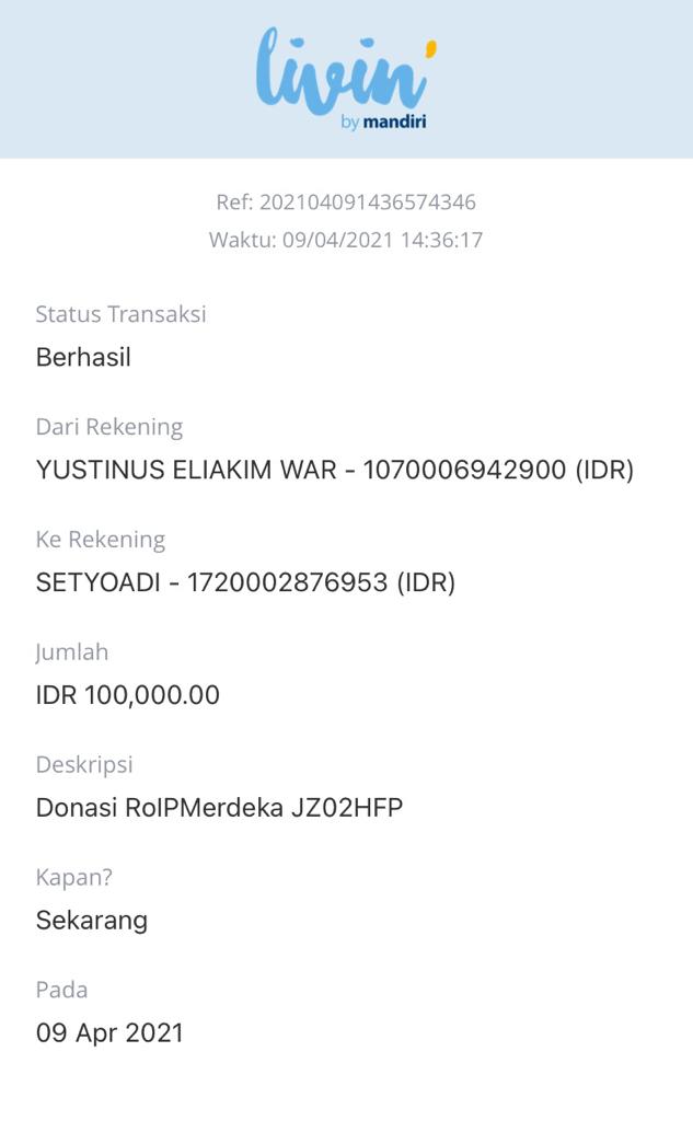 | 453 | 09-04-2021 | Rp 100.000,- | - | Donasi untuk ROIP Merdeka dari JZ02 HFP, Om YUSTINUS WARUWU | Ada | - |