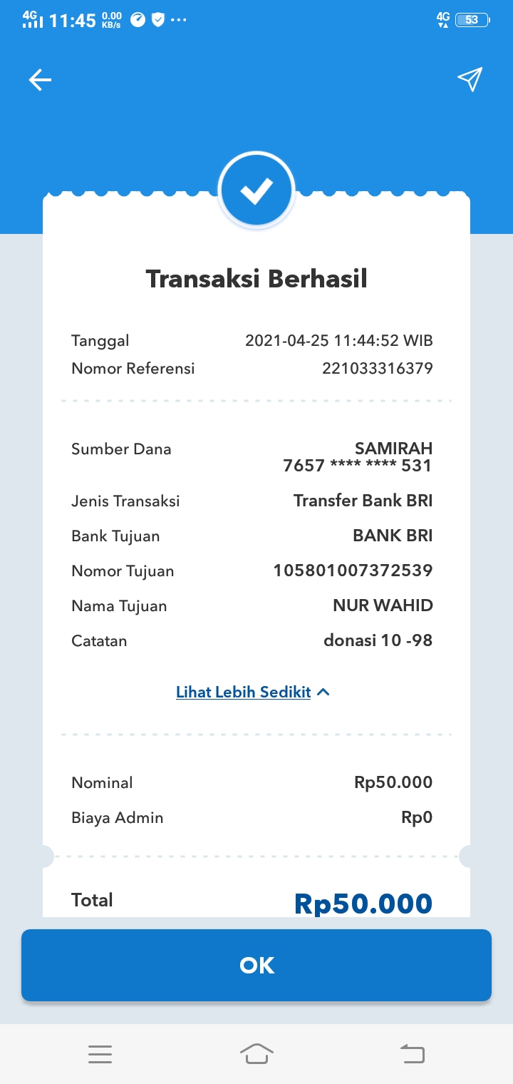 | 446 | 25-04-2021 | Rp 50.000,- | - | Donasi untuk 10-98 Spesial Ramadhan dari JZ04NUR Bang Hasan | Ada | - |